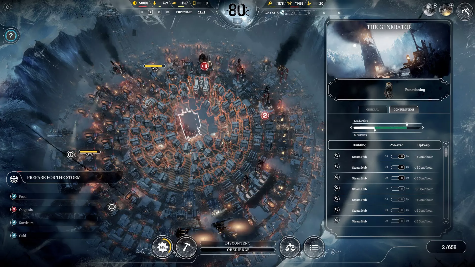 สิ่งที่ช่วยในการควบคุมอุณหภูมิมี 3 อย่าง Generator : ตั้งอยู่กลางเมือง คุณสามารถอัพเกรดให้เตาผลิตความร้อนดีขึ้น ครอบคลุมพื้นที่กว้างขึ้น และประหยัดถ่านมากขึ้นได้ ในขั้นแรก(Lv.1)จะใช้ถ่าน 6 หน่วยต่อชั่วโมง ขั้นต่อไป(Lv.2)ต้องใช้ถ่าน +100% คือ 12 หน่วย และ Lv.3 18 หน่วย Lv.4 24 หน่วย การอัพเกรดเพิ่มรัศมีให้ผลแบบเดียวกัน คือ สมมติคุณเปิดเตา Lv.1 ไว้ รัศมีระดับ 1-4 จะใช้ถ่าน 6/12/18/24 ตามลำดับ (โดยคุณสามารถปรับ Lv.ความร้อนและรัศมีได้ตลอดเวลา) พึงระลึกไว้ว่าคุณต้องปรับเตาให้ระดับอุณหภูมิสิ่งก่อสร้างรอบๆพอดีเสมอ (ช่วงสีเขียวขึ้นไป จะให้ดีก็สีส้มเป็นอย่างต่ำ) การปรับพลังงานความร้อนสูงไปจะสิ้นเปลืองถ่านมหาศาล ส่วนการปรับพลังงานความร้อนต่ำเกินไปจะทำให้คนเริ่มเจ็บป่วย ดังนั้นควรตรวจสอบ Temperature overlay อย่างสม่ำเสมอ โดยเฉพาะทุกเช้า และตอนที่อุณหภูมิมีการเปลี่ยนแปลงทุกครั้ง นอกจากนี้คุณสามารถกดดูดุลทรัพยากรถ่านหินแบบสรุปรวบยอดได้จากเตา ทุกครั้งที่มีการเพิ่มระดับพลังงานหรือเปลี่ยนแปลงกำลังการผลิตของถ่านหิน ต้องคอยมากดตรวจสอบอย่างสม่ำเสมอ อย่าให้ถ่านหินขาดดุลนานๆเด็ดขาด สุดท้ายนี้ตัวเตามีความสามารถ overdrive ซึ่งจะกล่าวถึงด้านล่างต่อไป Steam hub : เป็นปล่องความร้อนที่ช่วยกระจายพลังงานจากเตาไปยังพื้นที่รอบตัวมันเอง เหมาะที่จะสร้างคลอบคลุมพื้นที่รอบๆที่ความร้อนจากเตาตรงกลางยังไปไม่ถึง ตัวมันใช้ถ่านหิน 3 หน่วยต่อชั่วโมง แต่หากคุณอัพเกรดรัศมี มันจะใช้ถ่านหิน 6 หน่วยต่อชั่วโมง (คุณสามารถปรับรัศมีและระยะเวลาเปิดปิดปล่องได้ตลอดเวลา) ตัวปล่องจะกระจายความร้อนเท่ากับระดับความร้อนของเตาพลังงานหลักตอนนั้น ปล่องทุกปล่องและเตาพลังงานจะมีพื้นที่สีส้มบอกรัศมีตัวมัน ซึ่งไม่มีผลใดๆหากนำมาซ้อนทับกัน (ไม่ได้ร้อนขึ้นแต่อย่างใด) หากคุณอยากประหยัดถ่านก็สามารถเลือกระยะเวลาเปิดปิดให้สอดคล้องกับสิ่งก่อสร้างรอบๆ เช่นรอบๆเป็น workshop ทำงาน 8.00-18.00 คุณก็สามารถปรับเวลาของปล่องนั้นๆให้ทำงานตามนั้นได้ เพื่อประหยัดพลังงาน Heater : ช่วยเพิ่มระดับพลังงานของสิ่งก่อสร้างนั้นๆ โดยเปิดปิดได้เสมอ ขั้นที่ 1 จะเพิ่ม 1 ระดับพลังงานความร้อน ใช้ถ่านหิน 1 หน่วยต่อชั่วโมง ขั้น 2 ก็เพิ่มระดับพลังงาน 2 ใช้ถ่าน 2 ขั้น 3 ก็เพิ่มระดับพลังงาน 3 ใช้ถ่าน 3 หลักๆคือใช้เพิ่มความร้อนให้สิ่งก่อสร้างที่ตั้งอยู่โดดๆรอบนอกไม่หนาวเย็นจนเกินไป นอกจากนี้ยังใช้เก็บตกเวลาดู Temperature overlay แล้วสิ่งก่อสร้างไหนเย็นเกินไปก็ต้องเปิด Heater ให้ ตอนไม่มีคนทำงานมันจะปิดอัตโนมัติ และจะเปิดเองเมื่อมีคนทำงานอยู่ข้างใน อย่าง