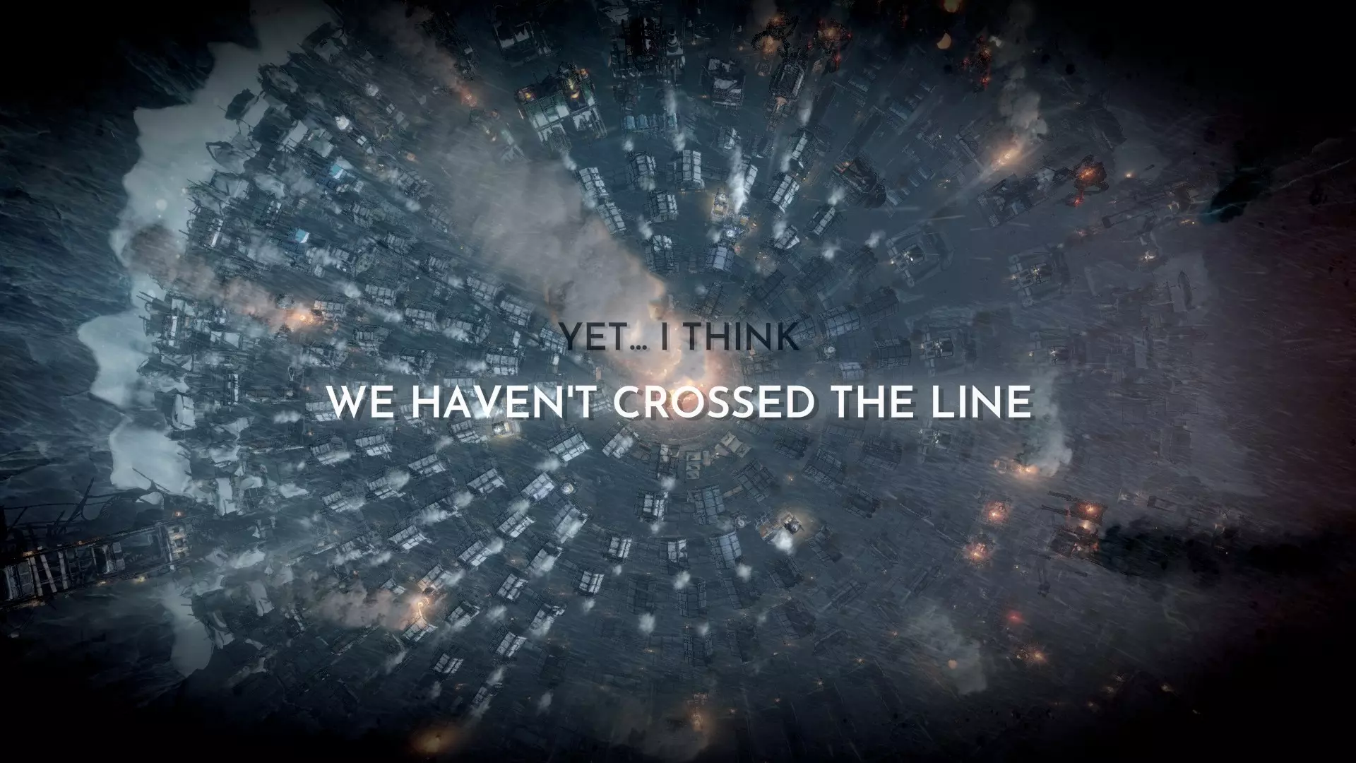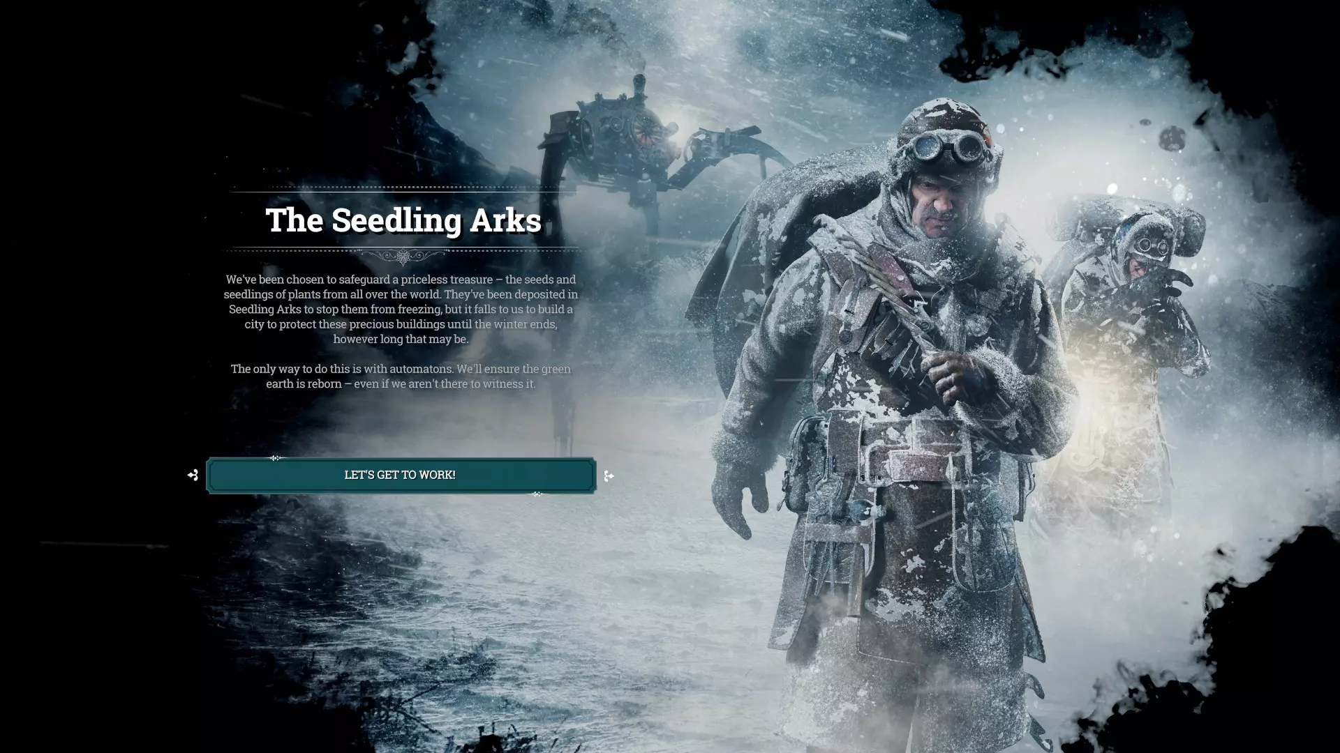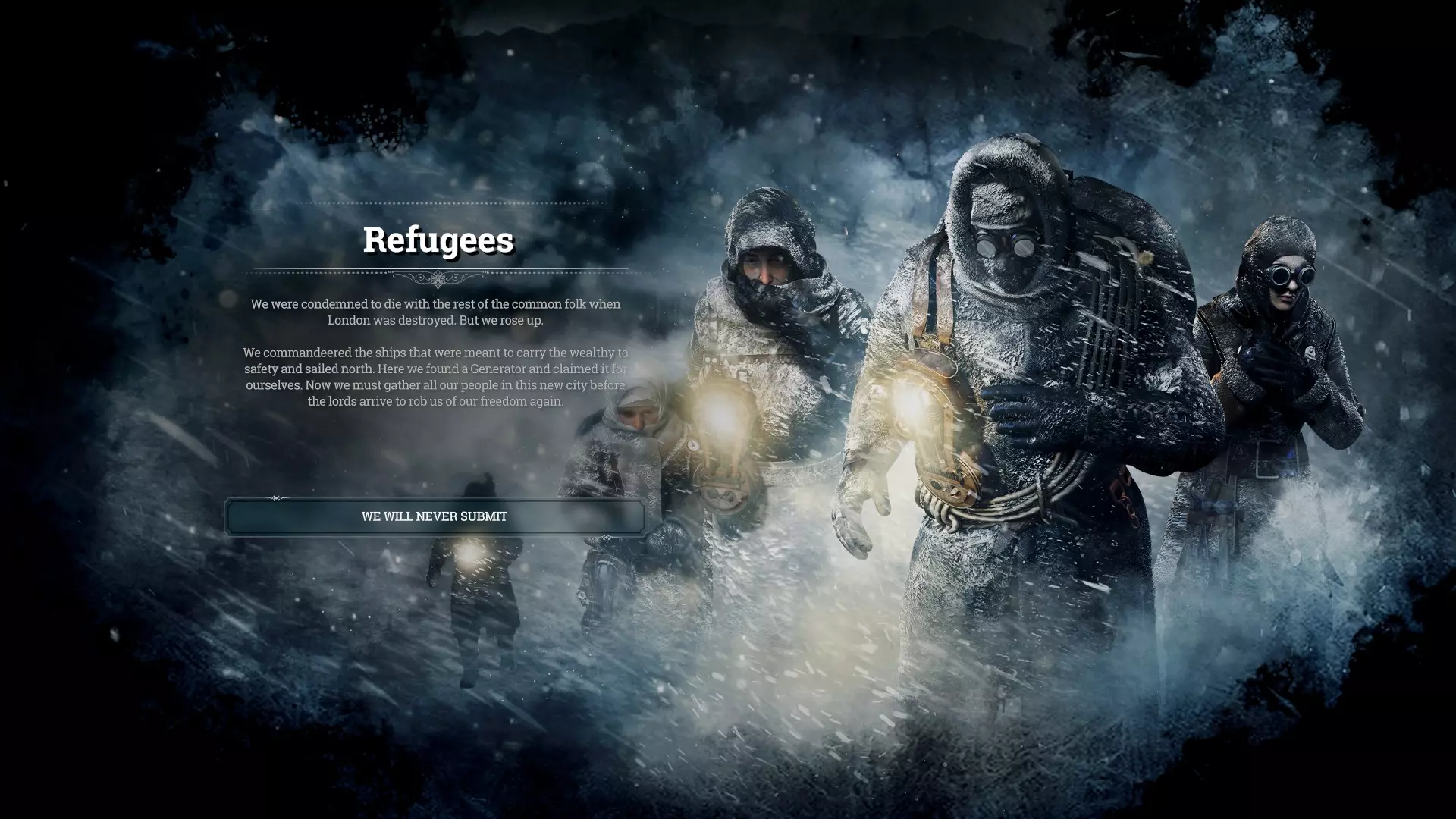 เนื้อเรื่องเริ่มต้น : คุณต้องคอยดูแลประชากรกลุ่มหนึ่งที่อพยพขึ้นเหนือมาจาก London เพื่อหาพื้นที่เหมาะสมสำหรับสร้างเมืองใหม่ คุณจะเริ่มจากกลุ่มคน 80 คน (เป็นเด็ก 15 ตน) และทรัพยากรที่ให้มาหยิบมือหนึ่ง รีบเก็บทรัพยากรและสร้างที่พักให้ทุกคน เริ่มแรกเกมจะบอกให้คุณจุดเตาพลังงาน เกมจะแนะนำให้คุณสร้าง Beacon และค้นหาผู้รอดชีวิตที่ติดค้างอยู่กลางทาง รีบสร้าง scout ออกไปค้นหาทันที พยายามส่ง scout สำรวจไปไกลเรื่อยๆ จนคุณเจอ automaton ตัวนึงที่สะพาน เลือกส่งมันกลับเมืองหรือแยกชิ้นส่วนเอาทรัพยากร (ผมมักเลือกแยกชิ้นส่วน เพราะได้ 2 steam core) เกมจะให้คุณค้นหาเมืองของผู้รอดชีวิตอื่น ตรงนี้ก็พัฒนาเมืองกับส่ง scout ออกไปเปิดแผนที่เรื่อยๆ เมื่อคุณเจอ Winterhome จะพบว่าเมืองนั้นล่มสลายไปแล้ว หลังจากพบว่าพวกเราอยู่โดดเดี่ยวประชากรในเมืองจะสิ้นหวังกับอนาคตและเกิดความวุ่นวาย คุณมีตัวเลือกกฎหมายเพิ่มมาเพื่อคุมความสงบเรียบร้อย (Order / Faith) (หากคุณไม่ส่งคนไปสำรวจ ประมาณวันที่15 ก็จะมีผู้รอดชีวิตจาก Winterhome มาแจ้งข่าวเมืองล่มสลายอยู่ดี) หลังจากเจอ Winterhome จะมีการเปิดพื้นที่ใหม่ๆให้ scout ไปสำรวจเพิ่มเติมได้ ให้ทำควบคู่ไปกับการสร้างเมืองให้สงบเรียบร้อย ปลดล็อคสิ่งก่อสร้างและความสามารถที่ช่วยควบคุม hope / discontent ก่อน พวกคนที่รู้สึกสิ้นหวังกับชีวิตที่เมืองของเราและอยากกลับลอนดอน พวกนี้จะถูกเรียกว่า Londoners ซึ่งพวกเขามีกำหนดเวลาที่จะเดินทางออกจากเมืองเราชัดเจน โดยระหว่างนี้อาจหากประชาชนไม่พอใจคุณ จะทำให้มีคนเข้าร่วมพวก Londoners มากขึ้น แต่หากคุณเอาใจใส่ประชาชนดี (Discontent น้อย hope เยอะ) คนจะผละหนีจากพวก Londoners เรื่อยๆ ระหว่างนั้นพวก Londoners จะก่อให้เกิดความวุ่นวายในเมืองมากพอสมควร เช่น พ่นสีกำแพง ขโมยของ หากค่า discontent มีประมาณ 50% คนพวกนี้จะปราศรัยดึงคนเข้าร่วมกลุ่มพวกเขาด้วย ดังนั้นคุณอาจต้องมี guard หรือ faith keeper เพื่อรักษาความสงบเรียบร้อยภายในเมือง เมื่อถึงเวลาที่กำหนด พวก Londoners จะเดินทางออกจากเมือง คุณสามารถเข้าแทรกแซงได้หรืออาจปล่อยไป (และแถมเสบียงสำหรับการเดินทางให้พวกเขาด้วย) หากคุณดูแลประชาชนดีมาก จนพวก Londoners สลายไปเอง จะได้ achievement ด้วย นอกจากนี้การปลดล็อคกฎหมายสุดสายคือ New order / New Faith จะทำให้มีคนตาย แต่พวก Londoners ก็สลายไปด้วย เมื่อจัดการกับพวก Londonders แล้ว หลังจากนั้นไม่นานจะมีกลุ่มผู้อพยพเดินทางมุ่งหน้ามาเมืองของเรา กลุ่มผู้อพยพมี 3 ชุด โดยมาเว้นเวลาห่างกัน 1-2 วัน แต่ละกลุ่มจะมีคนเจ็บป่วยจำนวนหนึ่ง (กลุ่มหลังๆจะมีผู้ป่วยหนักปนอยู่มาก) คุณเลือกได้ว่าจะรับผู้อพยพไหม เป็นบางส่วนหรือทั้งหมด สักพ
