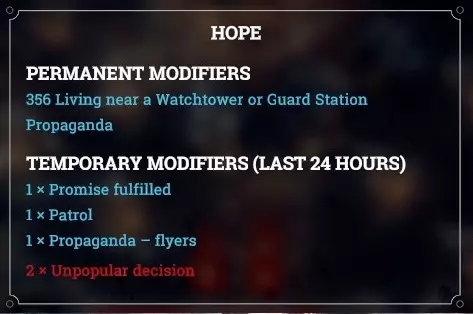 您所看到的希望之管示例涉及两类影响因素: - 永久修正:这是产生影响的永久性因素,蓝色为正面因素,红色为负面因素。这些变量在您不解决原因的情况下将一直存在。 - 临时修正:这是产生影响的暂时性因素,可能由某些选项中的决策导致。法律放宽、公民契约完善,以及各种建筑能力的运用,这些因素产生的希望值,放置一段时间后也会自行消失。你会发现许多因素对这两个数值都有影响,因此它们会出现在两个计量条中(例如,使用巡逻会降低不满值,增加希望值)。技术表与评论 第一部分