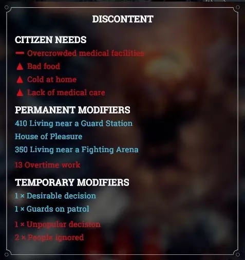 您所看到的不满指标有三个相关因素:市民需求:表明市民需要某些东西,而这些需求尚未得到解决。关于医疗设施过度拥挤,前面有一个减号标记,意味着此因素导致的不满值是固定的,若您解决了该问题,新增的不满值就会消失。还有劣质食物/寒冷方面的问题。home / lack of med 前方有向上箭头,表示只要问题持续存在,这些因素导致的不满值就会不断增加,而如果你解决了问题,该数值就会停止增长。 永久修正值:这些是产生影响的永久性因素,蓝色为正面因素,红色为负面因素。除非你解决根源问题,否则这些数值将一直存在。如果你消除了它,例如关闭13处加班工作,不满值将会降低 - 临时修正:这些是临时影响因素,可能来自某些选项中的决策、法律解除、公民契约补充,以及使用各种建筑的能力。这些因素导致的不满值放一会儿它自己就会消失了