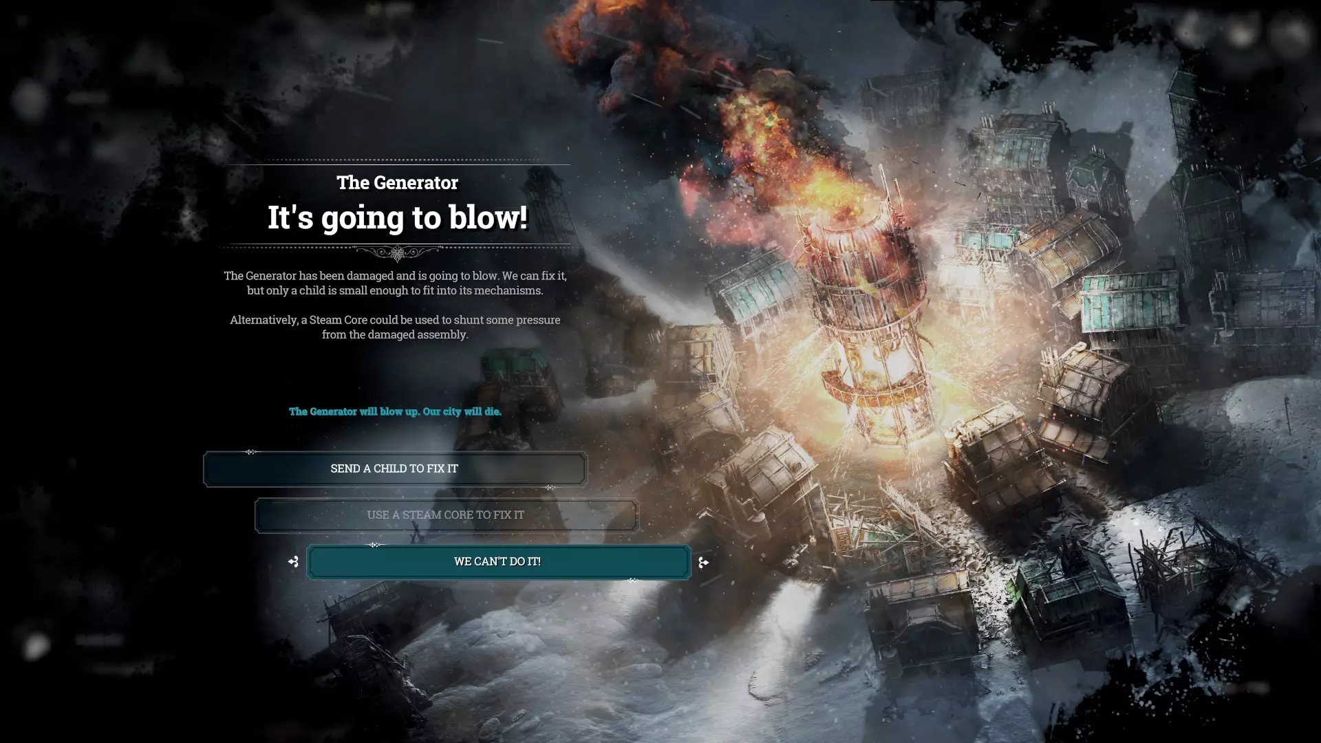 补充关于过载功能的使用说明:过载是指暂时提高熔炉温度,代价是熔炉的损耗增加。它不会额外消耗煤炭,但需要适时关闭让熔炉休息,以防爆炸。如果某天温度下降,查看温度叠加层时发现有大量低温建筑,你需要提高熔炉发电机的能量等级。不过需要花点时间提高温度,在这期间你可以使用超频功能先将温度升高,防止建筑等物体过度冷却。当熔炉达到所需能量水平后再关闭超频功能。夜间的空气通常比白天更冷,你可以选择开启超频功能。深夜为了减少当晚的患者数量,白天时段让炉子休息,或许可以选择切换能量等级以进一步节省矿石,借助超频模式(overdrive)辅助,例如二级(lv.2)与一级(lv.)切换。1+过载 当过载导致能量核心充满时会发生爆炸,但爆炸前可以选择牺牲1名孩童(用于修复核心)或牺牲蒸汽核心,若不执行任何操作则会直接爆炸。 疾病与死亡