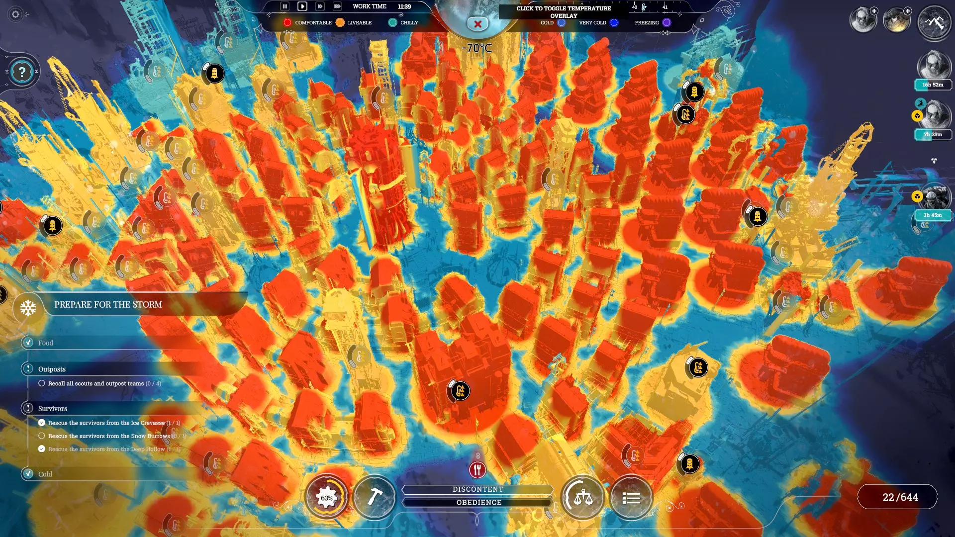 温度叠加层是你需要时刻打开查看的界面,它会显示建筑内的温度,具体如下: - 舒适(Comfortable):红色 - 宜居(Liveable):黄色 【建议将温度保持在该等级及以上】 - 微凉(Chilly):绿色 【最低建议将温度保持在该等级及以上】 - 寒冷(Cold):蓝色 - 极寒(Very cold):深蓝色 - 冰冻(Freezing):紫色绝对不要让人们在这些建筑里工作