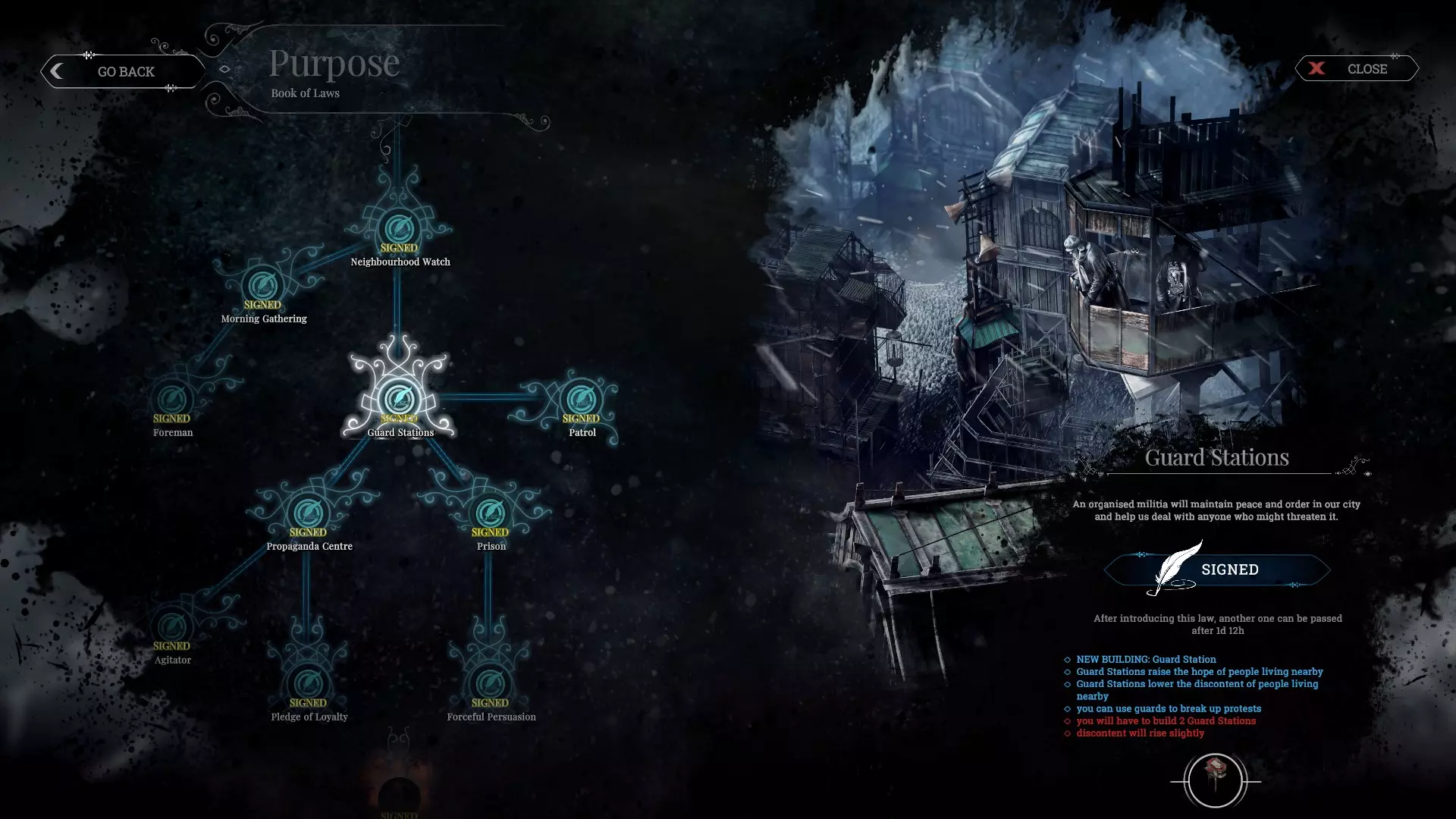 การปลดล็อคกฏหมายใหม่ๆ เป็นสิ่งที่มีความสำคัญในการช่วยควบคุมประชาชน เป็นตัวบ่งบอกว่าสภาพสังคมที่คุณสร้างออกมาจะเป็นอย่างไร มันช่วยปลดล็อคสิ่งก่อสร้างใหม่ๆ ความสามารถใหม่ๆ ที่ช่วยเพิ่ม hope และลด discontent ได้ แม้ว่าในระยะสั้นการปลดล็อคกฎหมายบางอย่างจะทำให้ประชาชนไม่พอใจ แต่จะมีคุณประโยชน์มหาศาลในระยะยาว กฎหมายต่างจากเทคโนโลยีตรงที่ถ้าคุณเลือกมันไปแล้วจะใช้งานได้เลย โดยไม่สามารถยกเลิกกฎหมายที่ปลดไปแล้วได้ ต้องรอให้ครบเวลาที่กำหนดจึงจะมาปลดเพิ่มได้ใหม่ ดังนั้นคุณต้องคิดให้ดีก่อนการเลือกแต่ละครั้ง เพราะอะไรปลดก่อนก็ย่อมได้ใช้ก่อน กฏหมายเกี่ยวกับการปรับตัว (Adaptation) เกี่ยวกับกะการทำงาน : นี่เป็นกฎหมายที่จำเป็นต้องปลดล็อคเป็นอันแรกๆ จำเป็นต้องใช้ในทุกๆฉาก เพราะมันทำให้เรามีความยืดหยุ่นมากขึ้นในการบริหารทรัพยากร กะ Extended shieft (6.00-20.00) มักใช้เพิ่มเวลาทำงานของโรงงานผลิตทรัพยากรที่กำลังขาด (หรืออย่างน้อยก็ใส่กับทุก workshop) ส่วนกะฉุกเฉิน (Emergency shift) จะทำให้สิ่งก่อสร้างนั้นๆทำงาน 24 ชม. มักใส่กับ workshop เพื่อช่วยเร่งการวิจัยในช่วงแรกๆ อย่างไรก็ตามหากใช้แล้ว คุณต้องระวังประชากรเจ็บป่วยเพิ่มเติมจากการทำงานท่ามกลางอากาศหนาวๆตอนกลางคืนด้วย เกี่ยวกับการจัดการเด็ก : คุณเลือกได้ว่าจะเอาเด็กมาใช้แรงงานหรือไม่ ซึ่งมันก็มีข้อดีข้อเสียต่างกันไป หากคุณใช้แรงงานเด็ก (Child labor) คุณจะมีแรงงานเพิ่มมาจำนวนมาก ซึ่งทำให้ได้ทรัพยากรกลับมามากขึ้น หากคุณไม่ใช้แรงงานเด็กจะต้องสร้างสถานเลี้ยงเด็ก (Child Shelter) หลังจากนั้นคุณสามารถเลือกกฎหมายให้เด็กๆไปช่วยหน่วยงานการแพทย์เพื่อเพิ่มประสิทธิภาพการรักษา หรือให้ไปช่วยเหลือในการวิจัยก็ได้ อย่างไรก็ตามส่วนมากผมจะเลือกใช้แรงงานเด็กในงานที่ปลอดภัย เพราะทำให้เราได้เปรียบตลอดเกมมากจริงๆ การเอาเด็กมาช่วยงานวิจัยหรือรักษาพยาบาลมันไม่จำเป็นเท่าไหร่ เพราะเราสามารถสร้าง workshop หรือ Medical post เพิ่มเติมได้เรื่อยๆอยู่แล้ว เกี่ยวกับการจัดการศพ : เลือกได้ว่าจะให้ฝังตามสุสาน (Cemetary) หรือให้โยนศพทิ้งกองรวมๆกันเผื่อไว้ใช้ในอนาคต (Corpse disposal) หากท่านเลือกฝังในสุสาน ก็สามารถเลือกอัพพิธีฝังศพต่อได้ ทำให้ค่า hope ลดไม่มากเมื่อมีคนตาย แต่หากเลือกเก็บศพไว้ใช้ประโยชน์จะปลดล็อค Snow pit และศพจะถูกนับเป็นทรัพยากรหนึ่ง โดยสามารถปลดล็อคการใช้ชิ้นส่วนศพเพื่อเพิ่มประสิทธิภาพการรักษาพยาบาลและการเอาศพไปเป็นปุ๋ยปลูกพืชได้ (หากอัพเพิ่มประสิทธิภาพการรักษาพยาบาลแล้ว มันจะเพิ่มให้ตลอดเวลา แม้ว่าไม่มีศพเหลือแล้วก็ตาม) เกี่ยวก