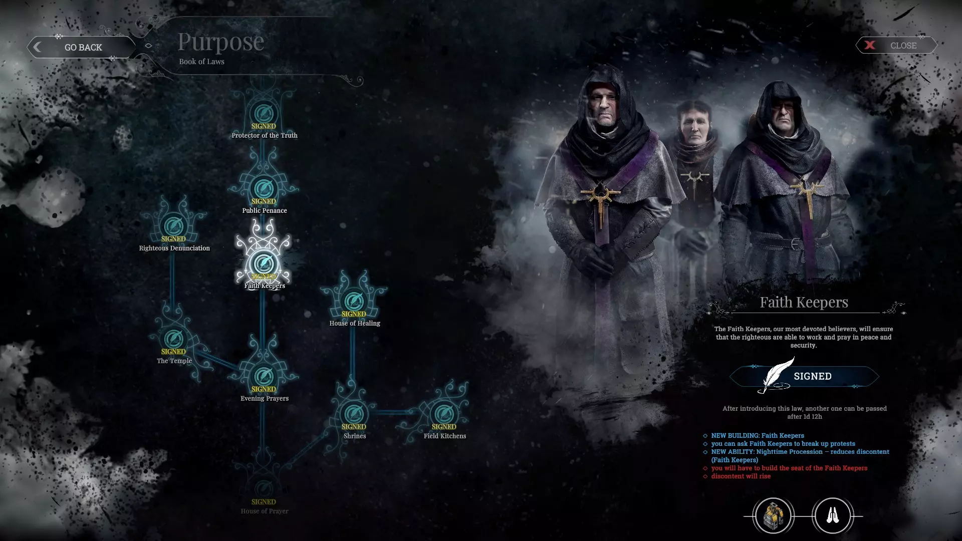 《信仰》的总体概念是强调利用宗教参与社会治理,反对者将成为罪人,最终可以建立新的宗教派别并利用信仰来控制民众。除了祈祷所外,还应解锁神社并将其分散建造以遍布整个城市。野外厨房这也会让周围的建筑变得温暖,但由于热量传播范围不大,我个人认为用处不大。治疗之家是一个非常有用的建筑,尤其是在困难难度下,因为角色经常受伤,它的效果只比医务室稍差一点。主线剧情事件总结 - 新家但它也能治疗重症患者,并且由于不使用Steam核心,我们可以全力制造垃圾信息,不必非得让工程师来操作,同时在治疗过程中还能逐渐增加希望值。它的缺点是有时会出现患者同意死亡的事件(拒绝治疗?安乐死?)神庙是另一个相当有用的前期建筑,并且可以选择多种能力,例如晚祷/公开忏悔/真相守护者。它们不仅仅是通往最终路线的途径,其本身也是有用的能力。信仰守护者负责在各种事件中维持秩序,在功能上类似于教派中的警察。“正义谴责”作用一般,由于它并非主线任务,所以可以稍后找时间再选择解锁。在主线任务中,若你解锁“新信仰”,就意味着要动用国家宗教的力量,而你自己也会成为神的代言人,持不同意见者将被视为罪人或异教徒。之后希望值会完全消失(转为奉献值)。掌权时可能会导致一些人死亡,还会建造处决平台,可以下令处决人员,大幅降低不满值。我可以说新信仰也是一种选择,和秩序路线的最终选择一样,可以选择启用或不启用。(但您可以选择在困难难度下解锁,这会让管理人口变得更容易)对比秩序和信仰路线——前者如同依靠武力进行统治,后者则像是洗脑式统治——两者都有类似的执法者(守卫/信仰守护者),都能在各种事件中使用,但秩序路线能更快获得守卫——具备管理能力不满与希望是对立的,但信仰路线的整体能力更加多样化且易于控制(而秩序阵营只有巡逻能较好地控制这些数值)。信仰路线的优势在于拥有治疗之家,可提升治疗能力,而野外厨房的作用相对较小。秩序路线的优势则是通过鼓动者和相关能力加快生产流程。监狱工头的作用相当小(其实很大)——信仰路线会因为使用某些技能和建筑而额外消耗口粮,而秩序路线则会分散使用多种资源。至于新秩序和新信仰这两条最终路线,几乎在各方面都很相似,但要直接推进到最终路线,信仰路线的代价似乎更低。因为中途解锁的能力更有用,此外信仰路线还能更快满级(解锁6个即可,而秩序路线需要解锁7个)。总结各自优点:秩序:更快获得警察/生产效率加成;信仰:几乎所有能力都有用,能更好地控制不满值和希望值/医疗建筑加成。