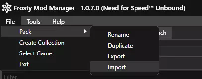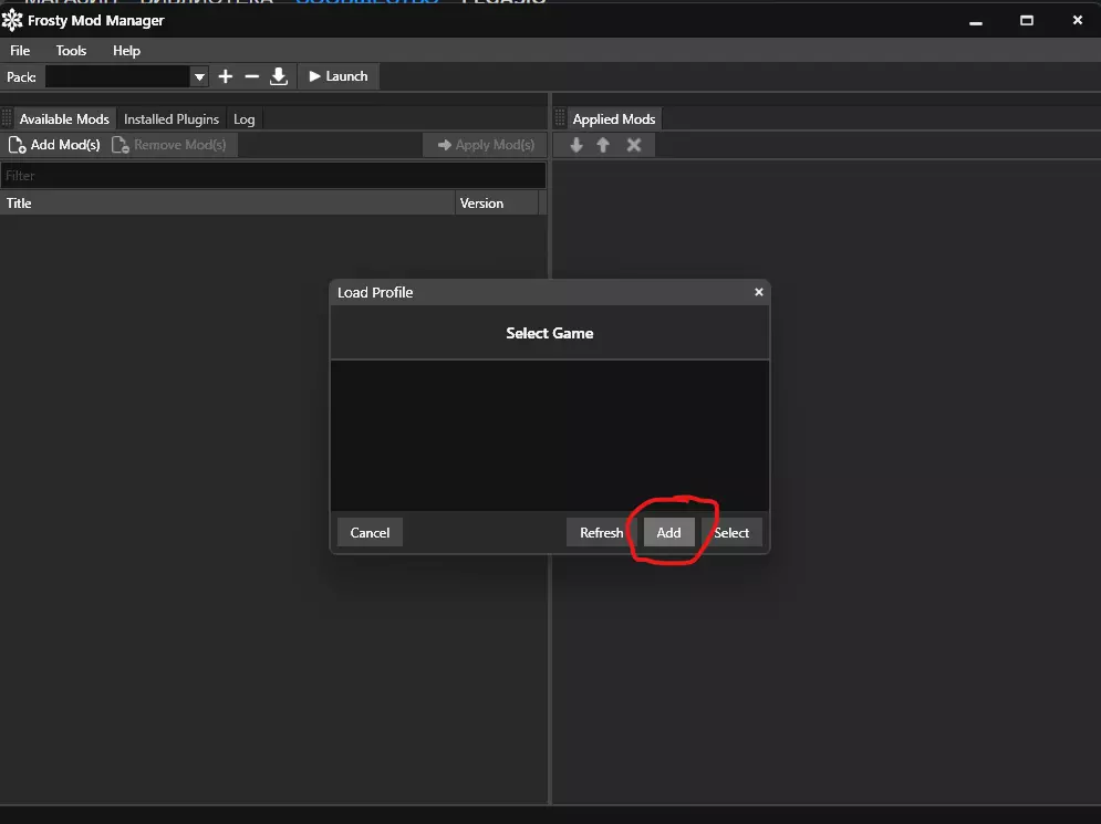 下载Frosty Mod Manager(对于《极品飞车:不羁》,Frosty版本必须至少为1.0.7)。 注意!不建议从谷歌云端硬盘下载Frosty Mod Manager,因为那里的版本已过时,可能会导致游戏出现问题。建议从上述链接的GitHub获取Frosty Mod Manager(HarGabt's Fork)——该版本为最新版本,并且包含重要的错误修复和其他改进。 接下来 打开Frosty Mod Manager并点击“Add”。