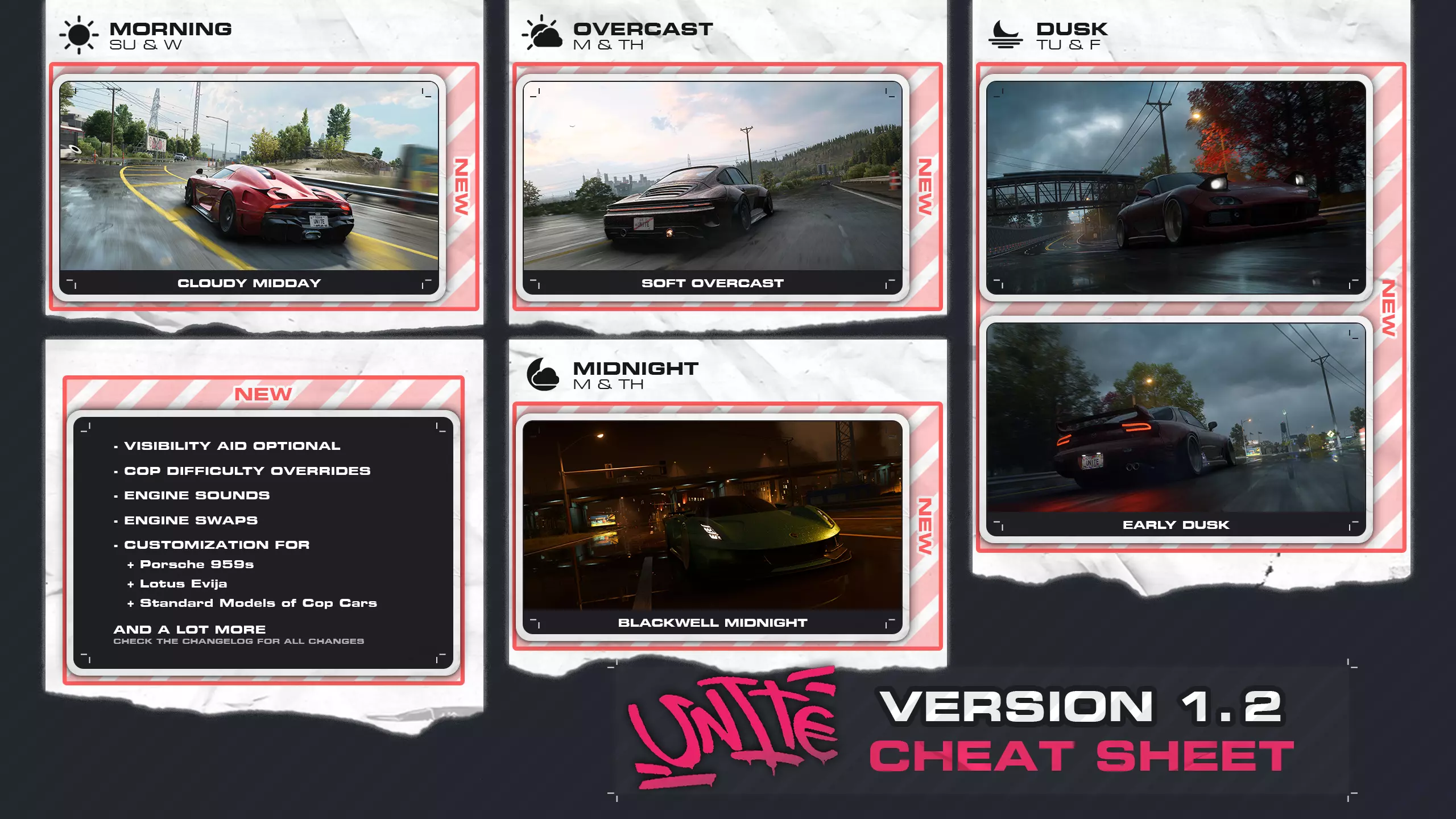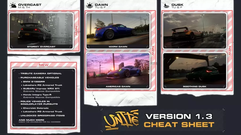 【声音】 - 修改了宝马M1、宝马M3 GTR、兰博基尼Murcielago和SRT Viper的发动机声音。 - 略微调整了宝马M3 Touring和福特Mustang Dark Horse(S650)的发动机声音及音量值。 【警察】 - 车辆的致命损伤状态持续时间已修改,现在取决于难度等级。 - 整体提升了车辆的耐久度。 - 调整了部分警察单位的加速度和最高速度数值。【自定义内容更新】 1. 剧情模式现已新增UNITE动画车牌。 2. 调整了BMW M3 Touring和Ford Mustang Dark Horse(S650)的前大灯与尾灯。 3. 解锁了BMW M3 Touring和Ford Mustang Dark Horse(S650)的速度通行证(Speed Pass)自定义物品。 4. 修改了Ferrari F40的后格栅透明度。 5. 移除了Nissan 370Z的Heritage Edition门槛,以修复车门相关漏洞。 6. Work Meister L1轮毂现已适用于所有车辆。RTR轮毂现已支持福特野马Dark Horse(S650)。 更新了Work Equip、SSR Speedstar和SSR Superstar等轮毂的尺寸,这些轮毂现在适用于所有车辆。 新增UNITE专属兰博基尼Countach LPI 800-4尾灯。 【自定义(BUY CUSTOM)】板块新增以下车辆: 日产Silvia K's(S14)X赛车手版 Speed Pass中的宝马M3 Touring漂移版 Speed Pass中的福特野马Dark Horse(S650)漂移版 Speed Pass中的宝马M3 Touring直线加速版 Speed Pass中的福特野马Dark Horse(S650)直线加速版