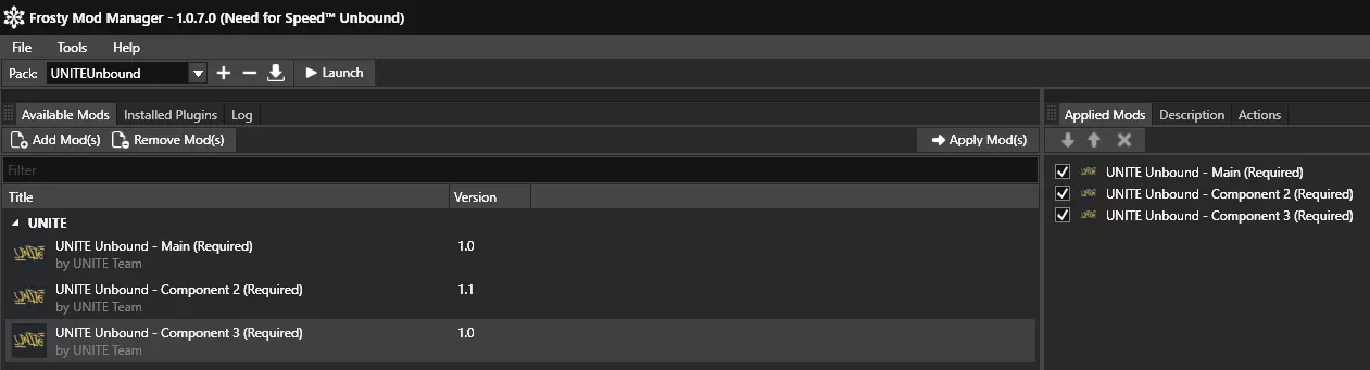 Когда будете готовы, нажмите «Launch», чтобы начать игру. Важно учитывать порядок установки мода — в Applied Mods порядок должен быть следующим: 1) Unite Unbound - Main (Required) 2) Unite Unbound - Component 2 (Required) 3) Unite Unbound - Component 3 (Required) 4) Unite Unbound - Online Patch [опционален, нужен для работы мода в онлайне, физика авто с ним остаётся оригинальной для равных условий в онлайне]. 5) Unite - Extreme Stance [опционален, работает только в оффлайне] Наслаждайтесь игрой! Часто задаваемые вопросы Игра вылетает после гонки или через некоторое время Возможные решения: Перепроверьте целостность файлов игры и удалите папку ModData из папки с игрой. Убедитесь, что у вашего железа отсутствует всякого вида разгон (overclocking). Попробуйте также снизить частоты вашего железа. Удалите кэш шейдеров из папки с сохранениями (Мои Документы/Need for Speed Unbound (TM)/shadercache) Переустановите драйвера вашего GPU. Попробуйте ограничить FPS до 60. Переустановите игру и мод. Обновите BIOS вашей материнской платы до последней версии. Моя машина проходит сквозь землю и регулировка ползунков стенса не помогает Возможные решения: Купите новую машину Уберите пневмоподвеску (Air Suspension) у машины Чёрный экран, бесконечная загрузка и/или поломанные текстуры/модели и прочее Возможные решения: Удалите папку ModData из папки с игрой, проверьте целостность файлов игры через лаунчер. Не используйте несовместимые моды, у которых похожий функционал с UNITE (типа модов с большими выплатами и касающихся кастомизации машины и т.д.). Убедитесь, что ваше железо соответствует максимальным системным требованиям (как минимум Intel i7-8700K или AMD Ryzen 5 3600, NVIDIA GeForce GTX 1660 Ti 16 ГБ оперативной памяти, игра также должна быть установлена на SSD накопитель, желательно на NVMe) В прологе у моей машины слишком высокий/низкий уровень для участия в заездах Возможные решения: Убедитесь, что вы начали игру прямиком с UNITE. Если вы начали игру до использования мода, удалите ваше сохранение и начните новую игру с модом. Убедитесь, что у вас стоит последняя версия мода. Убедитесь, что у вас не стоят моды на изменение характеристик машин и/или изменение выплат за заезд, а также, что у вас правильный порядок установки UNITE. Попробуйте отрегулировать значение Downforce (прижимная сила) в разделе HANDLING TUNING (ТЮНИНГ УПРАВЛЕНИЯ) во время паузы. При покупке машин у меня пишет PURCHASE FAILED (Сбой покупки)Скорее всего у вас куплен(ы) DLC. Возможное решение: Скачайте этот .fbmod[drive.google.com] и поставьте вместе с UNITE. Начните новую игру или при наличии резервной копии сохранения поставьте ваше предыдущее сохранение на место вашего текущего сохранения. Учтите, что данный мод не решает проблему, а только предовращает её появление в последующем. NFS Unbound подтормаживает, нагрузка процессора выше нормы, а то и 100% Возможные решения: Убедитесь, что игра полностью скэшировала все шейдеры. Скорее, вам потребуется подождать около 10-25 минут (в зависимости от вашего железа). Вы можете также попробовать проехаться по городу, чтобы кэш сгенерировался во всех местах. Закройте все необязательные для работы приложения. Попробуйте откатить драйвер вашего GPU до прежней версии. Отключите TRIM вашего носителя, на котором установлена игра. Установите CPU Fix от NFS Heat[github.com] (лично я не рекомендую) Сделайте апгрейд вашего железа, в частности CPU. На сходках (Linkup) неправильные задания и меня телепортирует в начало трассы во время онлайна Возможные решения: Отключите м