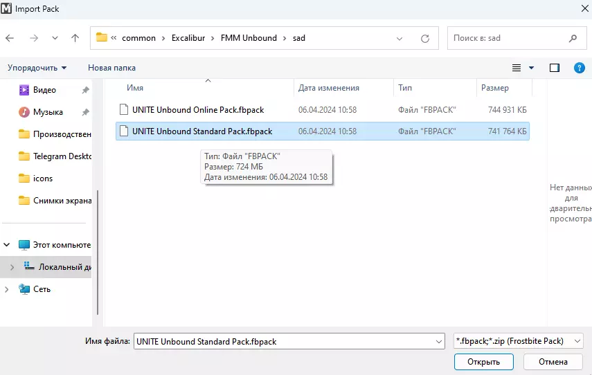 如果Mod管理器要求您提供加密密钥,您可以在模组作者的Discord频道的unite-faqs部分找到该密钥。 点击【Import】并在您解压UNITE Unbound的文件夹中找到已下载的.fbmod文件。需要安装Standard Pack。Online Pack为可选组件,用于在线功能。如果您想在联机模式下使用模组,需要安装Online Pack。