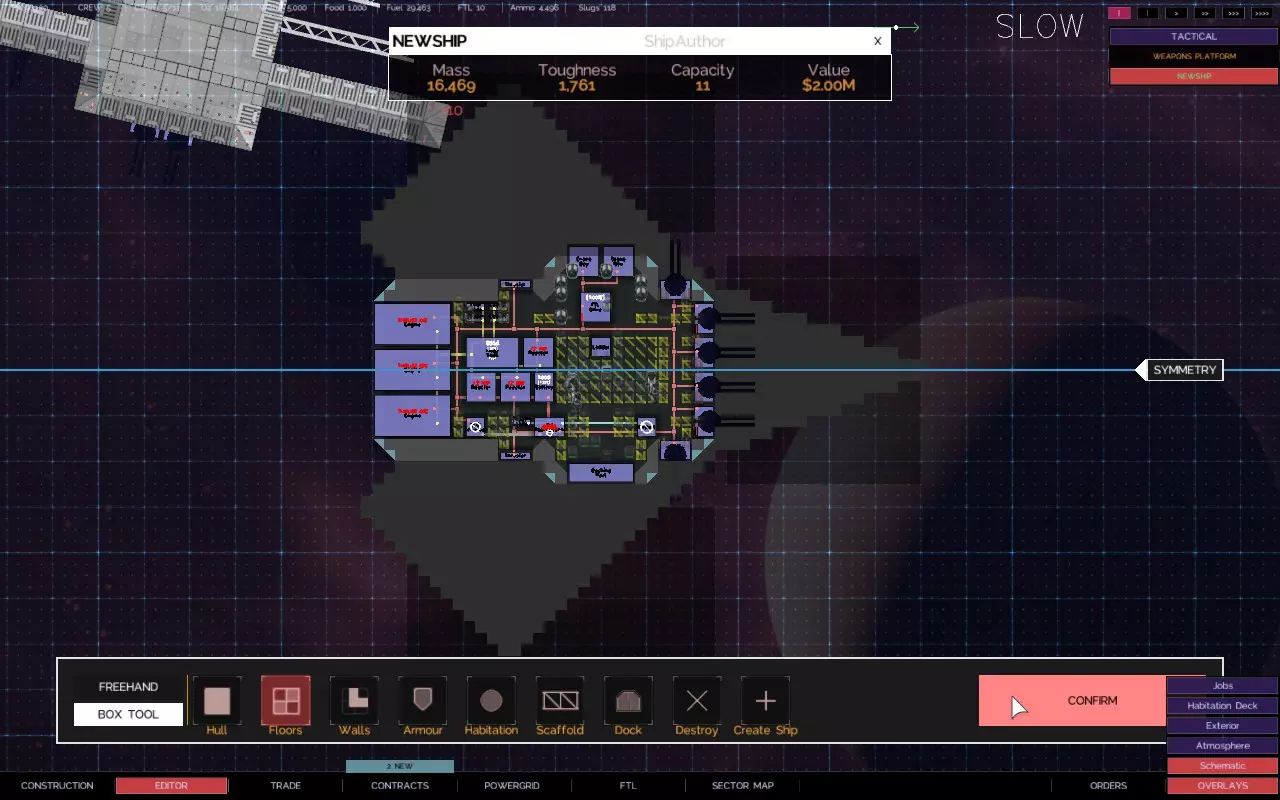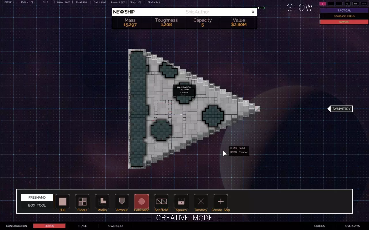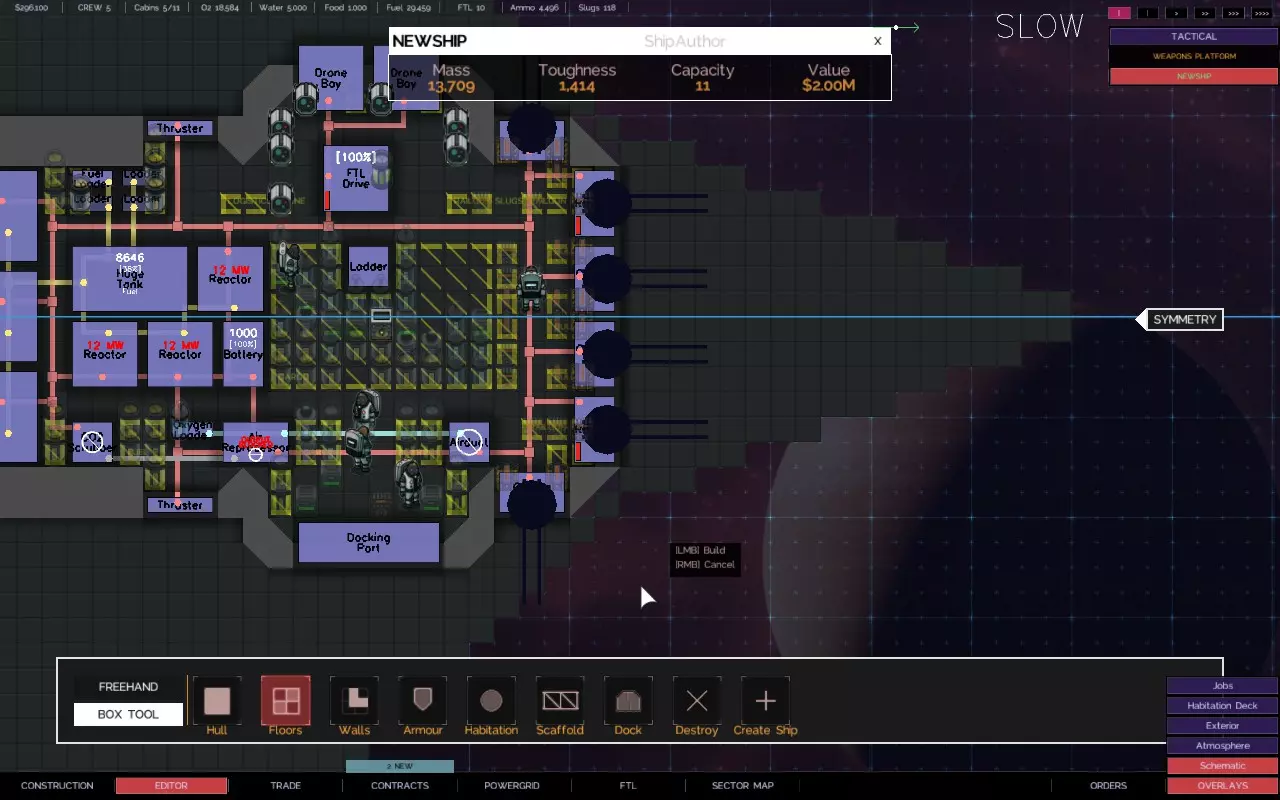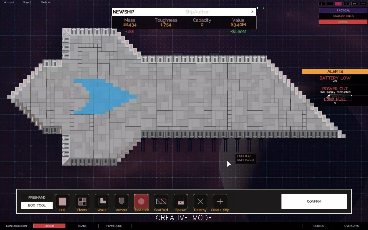 关于如何建造带有悬伸船体部分的舰船的快速教程 简介 【Alpha 2更新 - 由于输出被阻止,此技术不再适用于用户控制的舰船,但似乎仍适用于AI驱动的舰船。】 是否厌倦了创造力受到限制? 是否有一些很酷的舰船设计,但找不到地方安装那些讨厌的火炮、引擎和其他外露设施? 是否想建造三角形、圆形、锯齿形或其他奇特的船体形状,同时保持所需的点防御能力? 那么,我有个方法适合你! 步骤1 设计、创建并设置你的舰船内部布局。