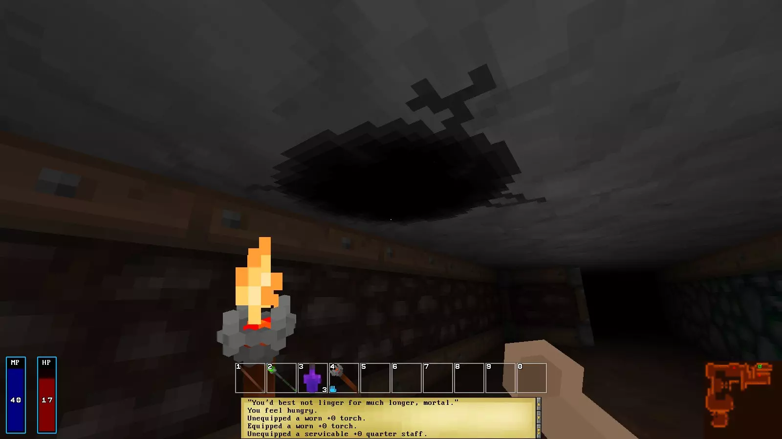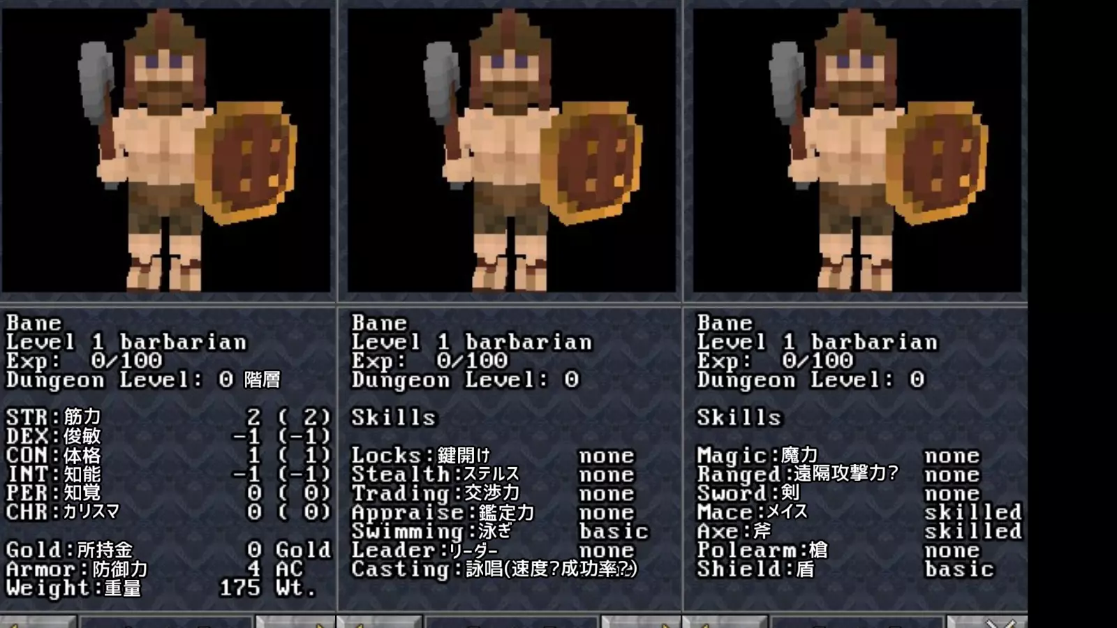 STR:筋力:(恐らく)攻撃力と重量の値を決定します 未検証 DEX:俊敏:移動速度 高ければ高いほど早く移動できます CON:体格:防御力と状態異常の回復速度を決定します INT:知能:魔力に影響する..?どう影響するのは未検証 PER:知覚:ステルスに影響します CHR:カリスマ:仲間の勧誘 店主との取引に影響します Skills(技能) Skillsはレベルアップで上昇せず、対応する行動を行うことで熟達していきます 例えば鍵開けなら宝箱を開けたりすることでレベルが上がります レベルはnone(なし)→novice(初心者)→basic(基本)→skilled(熟練)→expert(達人)→legend(伝説) の順で上がっていき、あなたの冒険の助けとなるでしょう レベルガイド キャラクターを作成したら、いよいよ冒険の始まりです まずプレイヤーはダンジョンの入り口へと降り立ちます 敵は出ないので安心してください 準備が出来たら先へと進み、下の階層へと降りる入り口(出口?)へと進みましょう ダンジョンは主に4つのエリアで構成されています 1-5Fは鉱山エリアです トラップも転がる岩しかなく、比較的安全なエリアです 敵として出現するネズミは、倒すとよくチーズを落とすので、見つけたら積極的に倒しておきましょう 5-10Fは沼地エリアです エリアの大半が水で構成されており、泳ぎのスキルがないと若干移動が不便です 注意すべきは、Fireの杖を持ったゴブリンです。Fireの魔法は攻撃力が高く、即死もありえます しかしながら倒せば必ずそのFireの杖をドロップするので、その後の冒険が若干楽になるでしょう また、水の中を泳ぐと、満腹度がゴリゴリ減っていきます 注意しましょう 10-15Fは砂の迷宮です 罠や障害物も増え、また食料が見つけにくくなります 1-10エリアの間でしっかりと食料を確保してから進みましょう 新たに出現するスコーピオンは、攻撃時に一定の確率でプレイヤーを麻痺状態にします 見つけたらなるべく近接戦はせず、余裕があるなら遠距離で倒すのが良いかもしれません 15-20Fは遺跡エリアです 1-15Fに比べMAPが入り組んではいませんが、即死要素が満載です 特にライトニングの杖を持つノームと、ミノタウロスに似た性能を持つデーモンには注意しましょう 20Fをクリアすると、いよいよヘルクス男爵との対決です ぜひ自分の目で確かめてください ヒントとして、魔法を反射する装備を持っていると、大分戦いが楽になります 入手しておきましょう サバイバルガイド Baronyは基本的に、知識があれば死ににくくなります ここでは初心者が躓きやすい要素を説明します - 1.鑑定(Appraise) 落ちているアイテムを拾ったり、宝箱からアイテムを入手したとき、その大半は未鑑定の状態になっています 未鑑定状態のアイテムは、性能・また呪われているかがわかりませんので、鑑定する必要があります 鑑定の方法は、インベントリにある未鑑定のアイテムを右クリックで選択した後、Appraiseを選択します すると、画面左上に鑑定中の表示が出て、100%になると、鑑定の判定が行われます 100%になったときに、成功すればアイテムは鑑定され、失敗であれば、もう一度鑑定が始まります また、鑑定はゲーム開始直後だと、(恐らく)100%になるのに長い時間がかかります これはキャラのAppraiseがnone(ない)またはnovice(初心者)であるためです Appraiseは、鑑定を行うことで熟達していきます Appraiseを伸ばすオススメの方法は、食料を鑑定する事です。武器や防具、スペルブックなどは鑑定に時間がかかるので、これらを鑑定してAppraiseスキルを熟達させるのは、非効率的です 食料は鑑定にあまり時間がかからないので、Appraiseが低い間は、食料を鑑定して熟達させましょう 最後に、冒険をすすめると、Gem(宝石)を入手すると思います Gemは鑑定すると店で高く売れますが、鑑定に非常に時間がかかるうえ、成功確率も低めです また鑑定できたとしてもGemの店が出ないと売れないので、鑑定は後回しでもいいかもしれません - 2.明かり ダンジョン内は暗く、明かりがないと探索がしにくいかもしれません 明かりを確保するには、壁などにかかっている松明を右クリックで取り外し、入手しましょう 松明は左手で持つことができ、持っている間周りを照らして視界を確保します しかし左手は、盾を装備すると塞がってしまうので、盾と松明を同時に持つことはできません ちなみに、スペースバーを押すことで、松明で防御をする事が出来ます 覚えておきましょう(盾も同様) 余談ですが、松明は、視界を確保できるメリットに対して、明かりを照らすことで敵に見つかりやすくなるというデメリットがあります。注意しましょう。 そして、松明はある程度使うと壊れます。壊れたら新しい松明に持ち替えましょう。またダンジョン内にはランタンもあります。ランタンは松明よりも壊れにくいので、見つけたら手持ちの松明と交換すると良いでしょう - 3.空腹 初心者に立ちはだかる最初の壁 それは空腹です Baronyには風来のシレンなどでお馴染みの、空腹度のシステムがあります ダンジョンを探