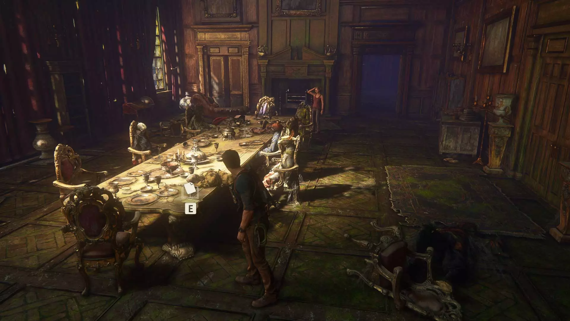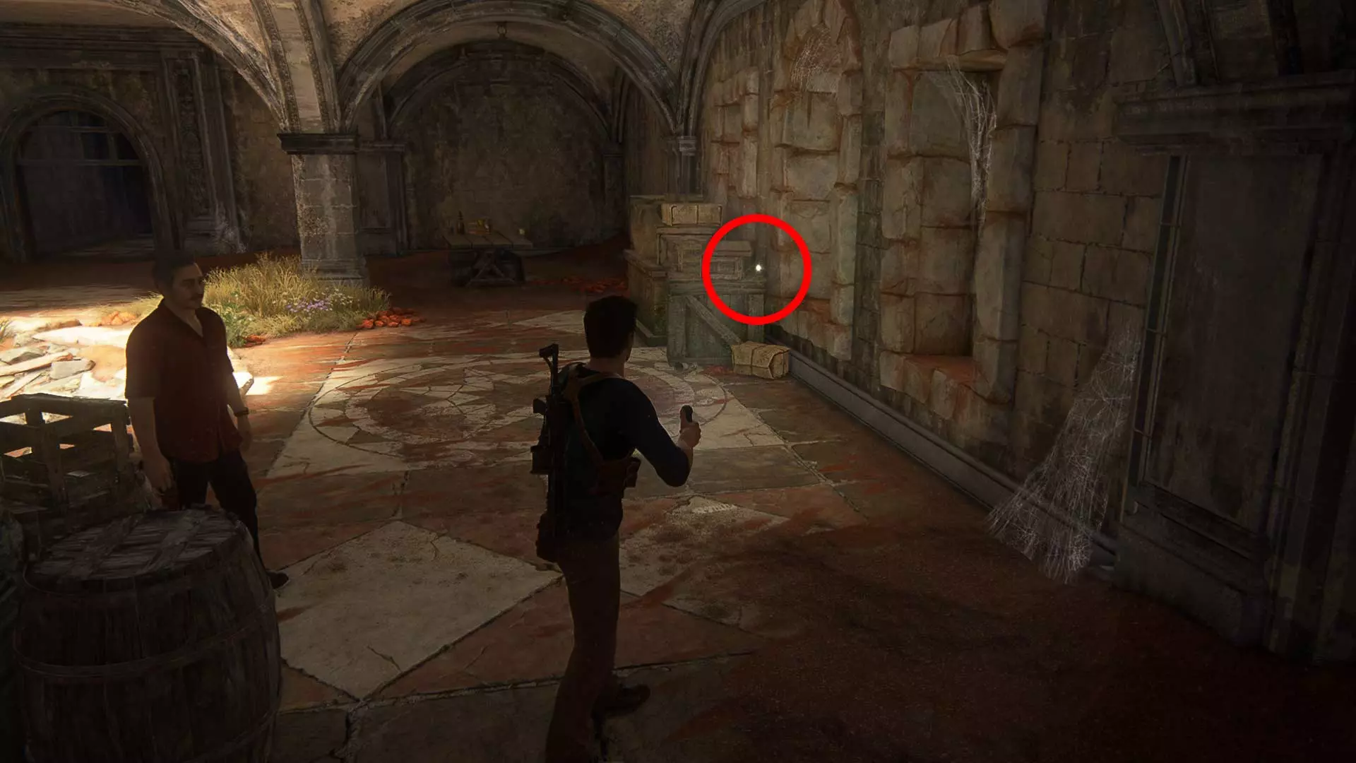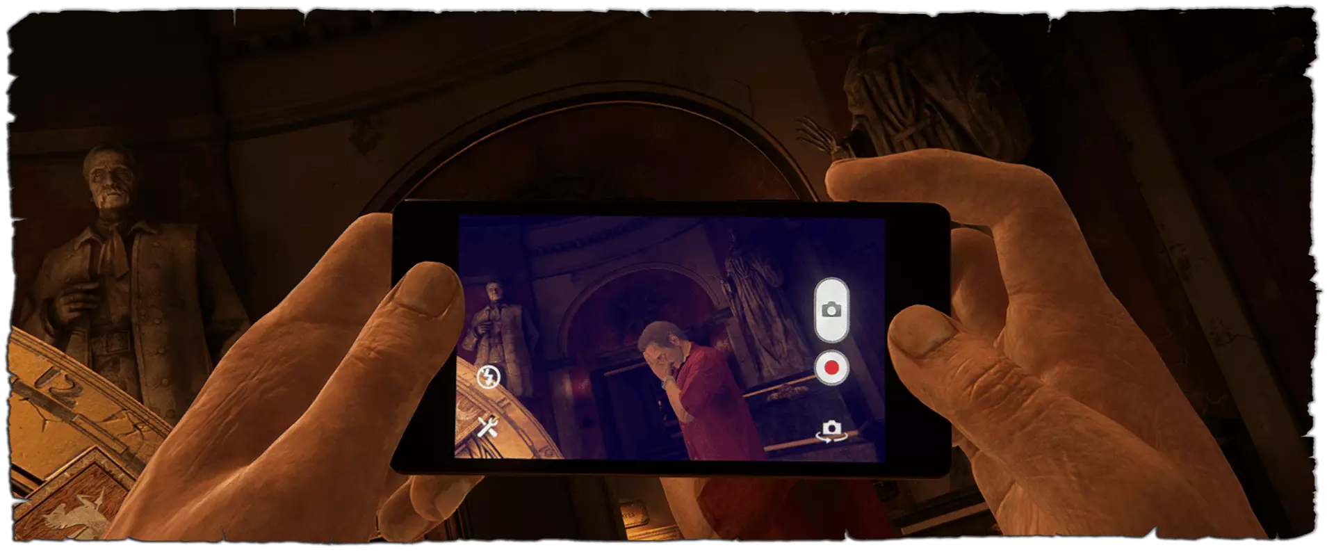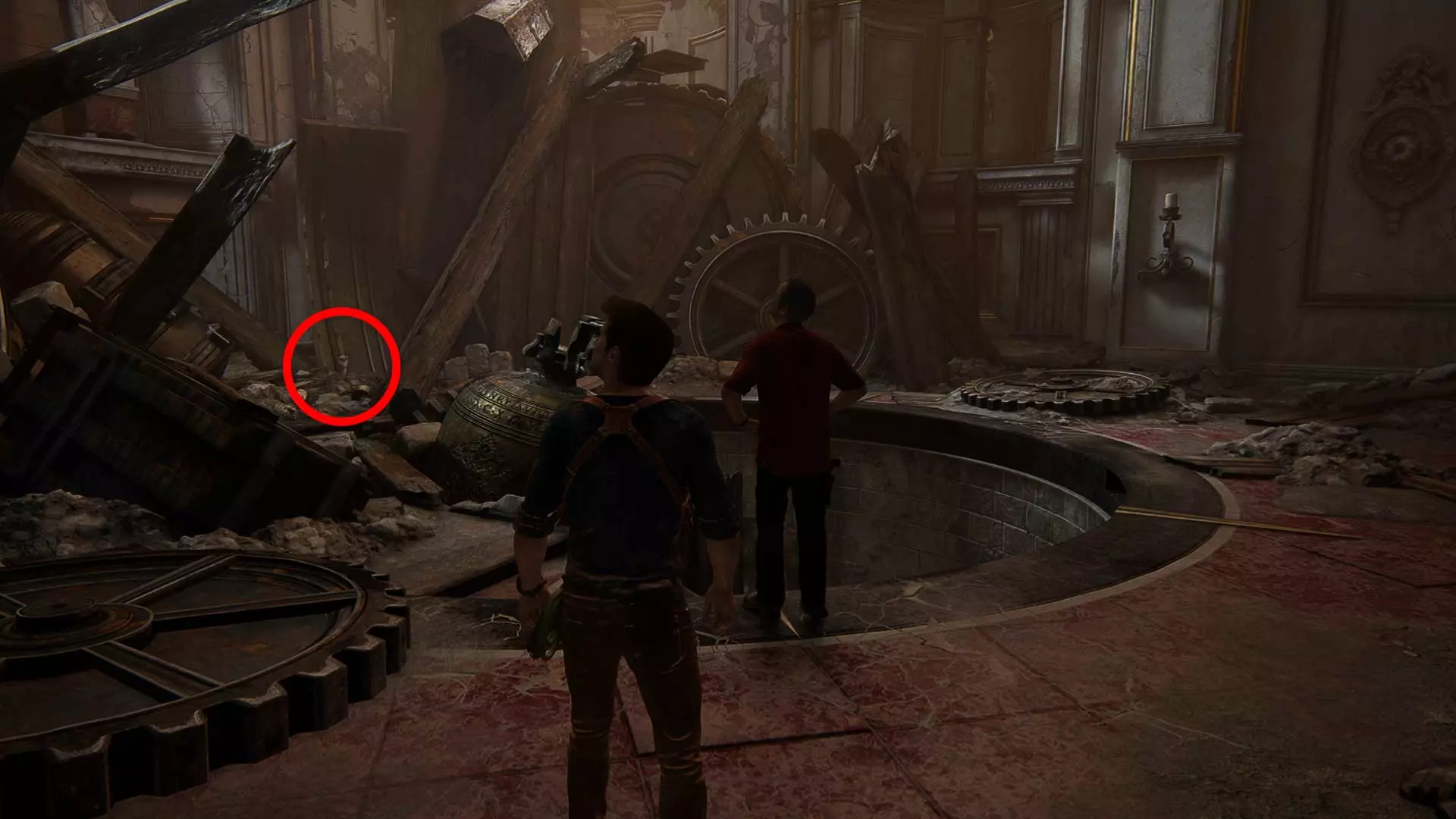 在钟楼地下室解开海盗符号谜题并打开第二扇门后,萨莉会把她的手机交给内特,让他拍摄轮盘上的海盗徽章。此时,将相机对准萨莉并拍照。