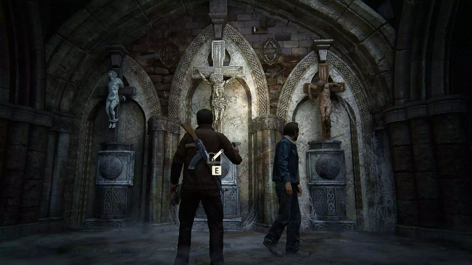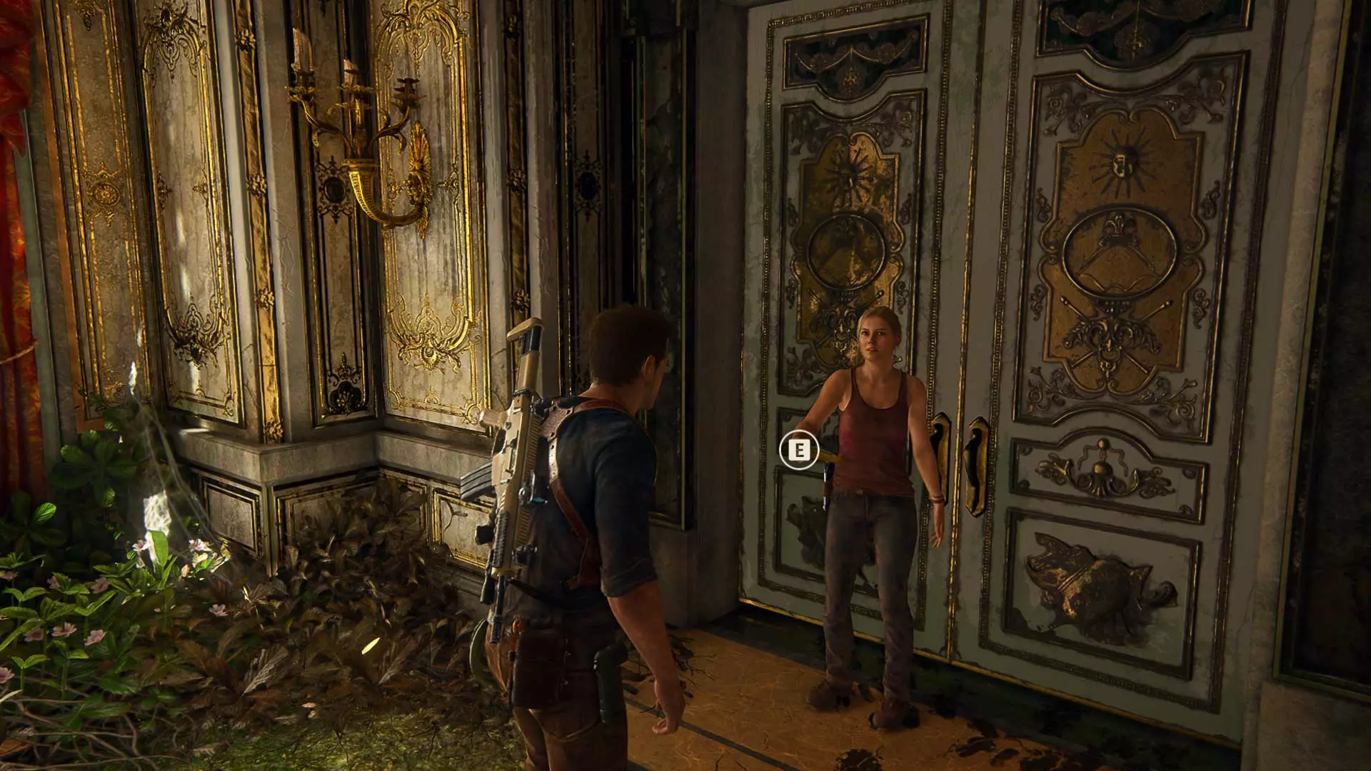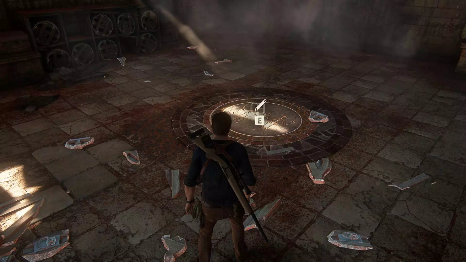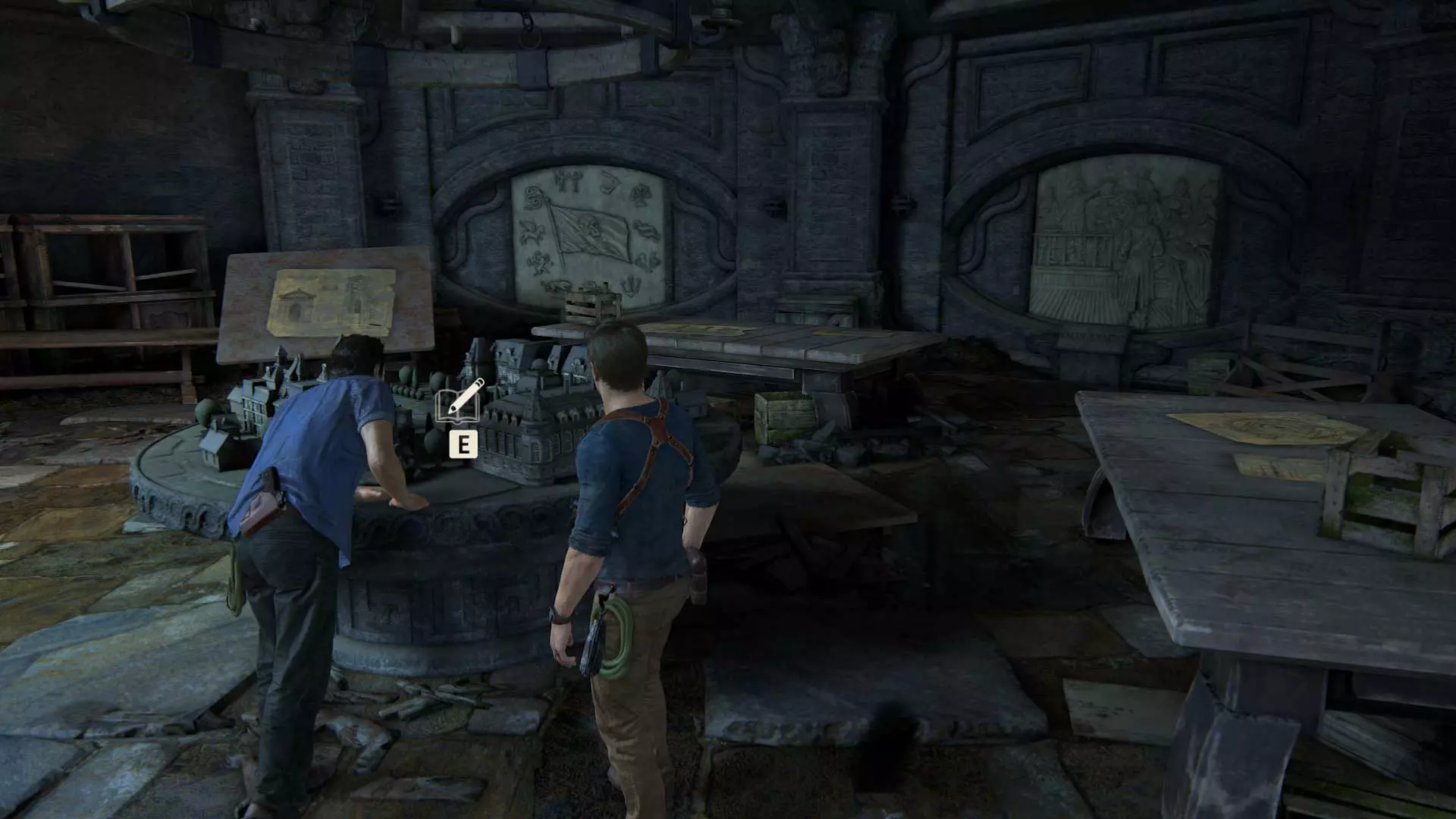在钟楼地下室解开海盗符号谜题并打开第二扇门后,萨莉会把她的手机交给内特,让他拍摄轮盘上的海盗徽章。此时,将相机对准萨莉并拍照。
