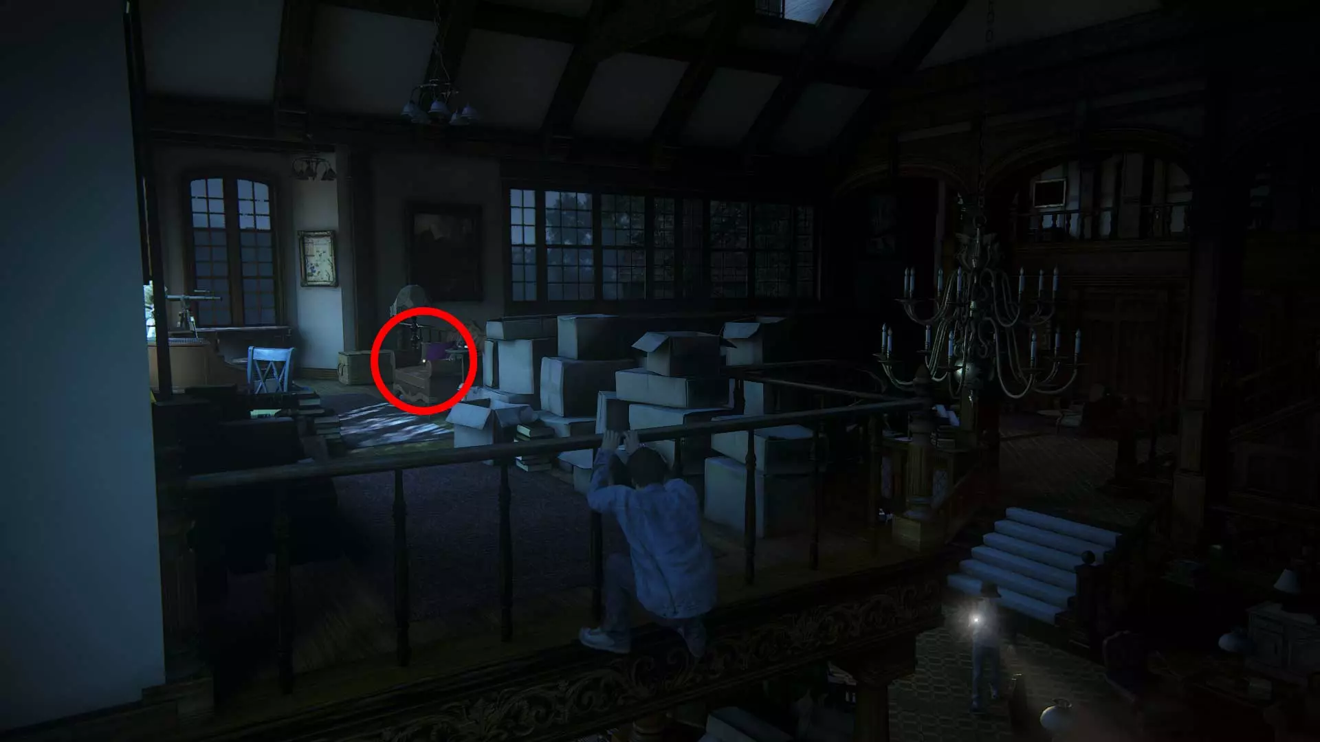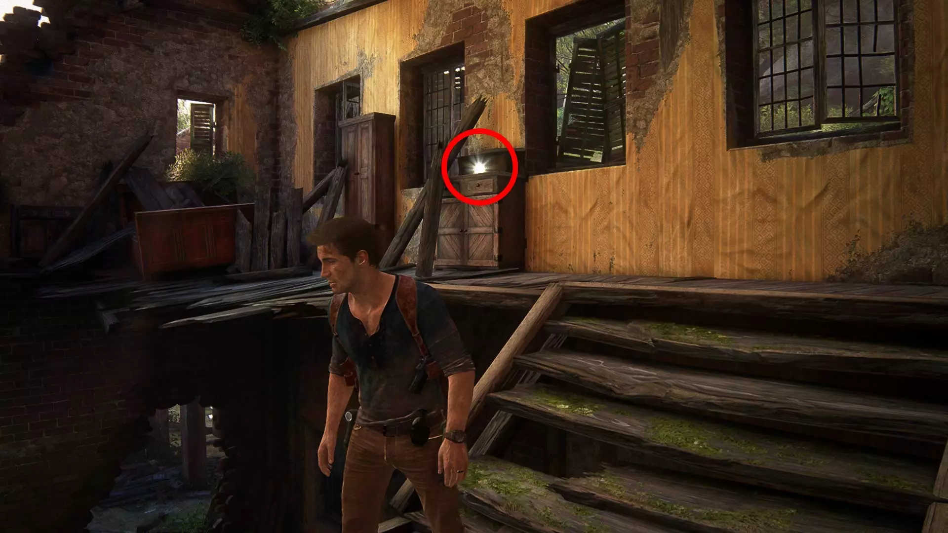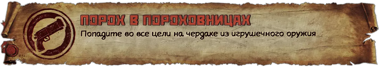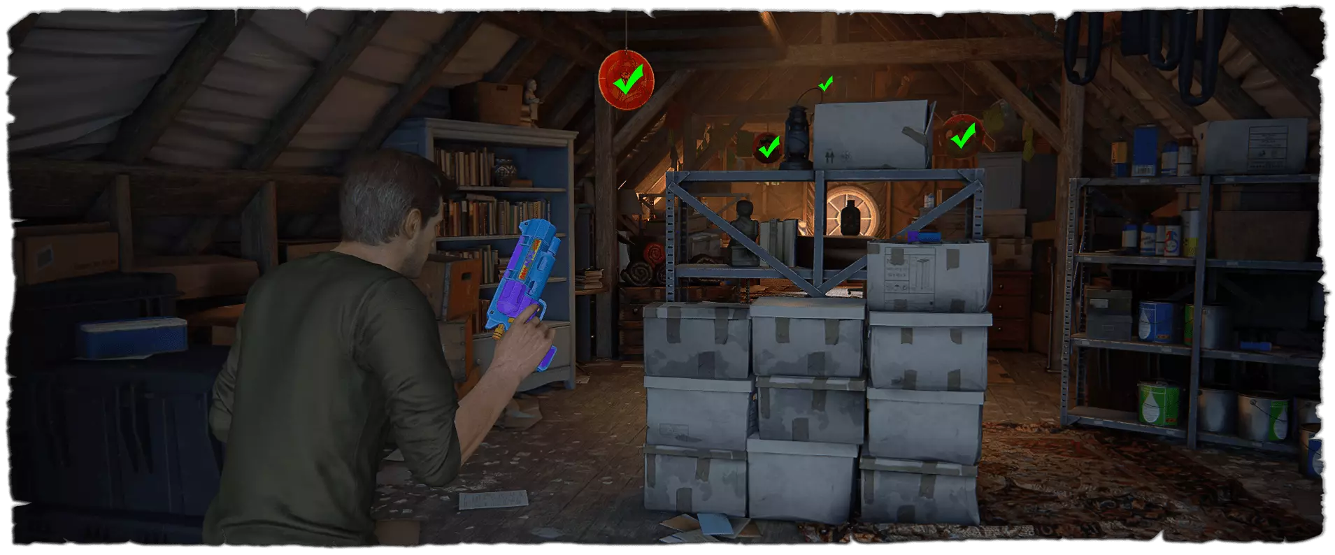 在房子的阁楼里找到德雷克的玩具手枪,从箱子里取出它,然后射击天花板上悬挂的所有4个橙色盘子。