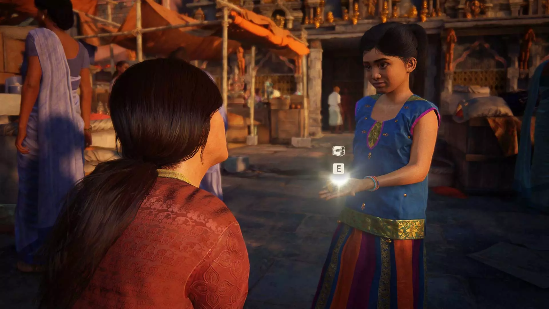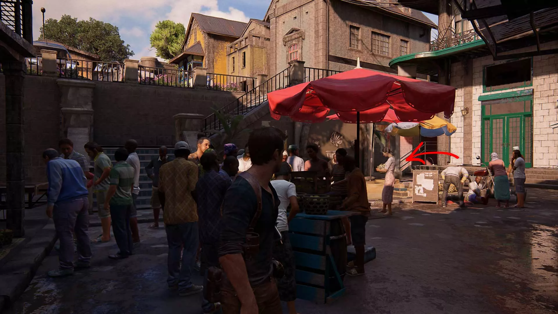 从章节一开始,前往市场广场的左侧,在那里你会遇到一位卖苹果的女商贩。买下苹果后,去找那个肩上有狐猴的男人。