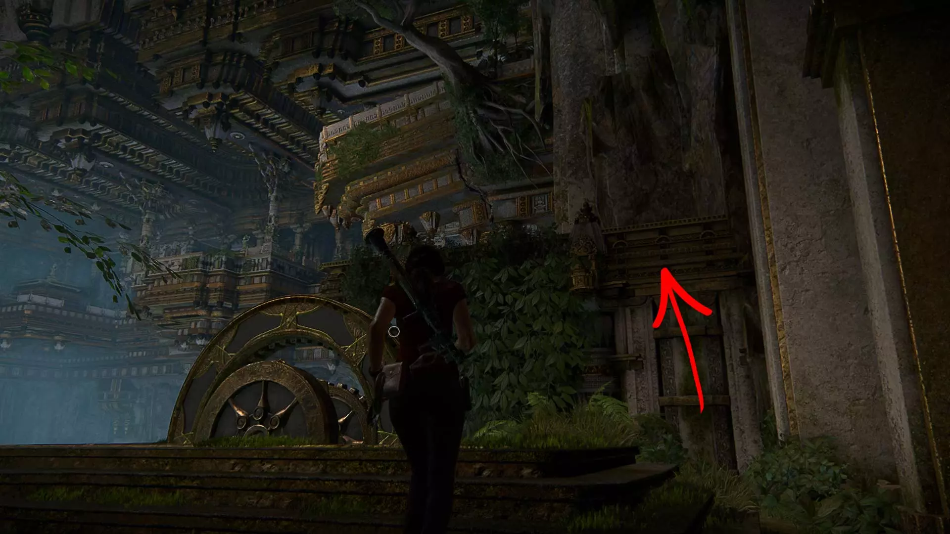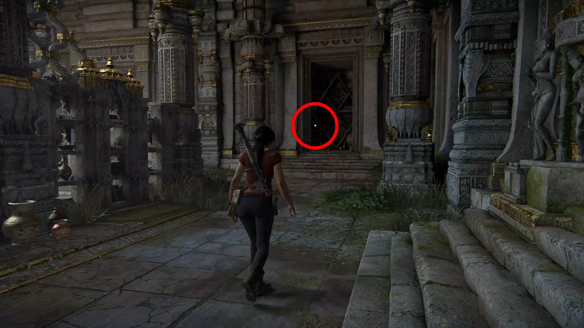 在前往大门之前,向左转并向下走,最后看一眼伽内什雕像并拍照。