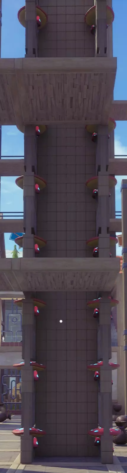 要实现平滑且可控的无限攀爬动作,两个蘑菇柱之间的距离应为6个单位(见图),并且堆叠高度也需每6个单位设置一次。巧合的是,【告示牌支架】提供的高度恰好符合这一要求,是比横梁更理想且更经济的选择。如果不介意额外花费,你也可以在建造中使用横梁(不过我个人更喜欢颜色匹配的告示牌外观)。