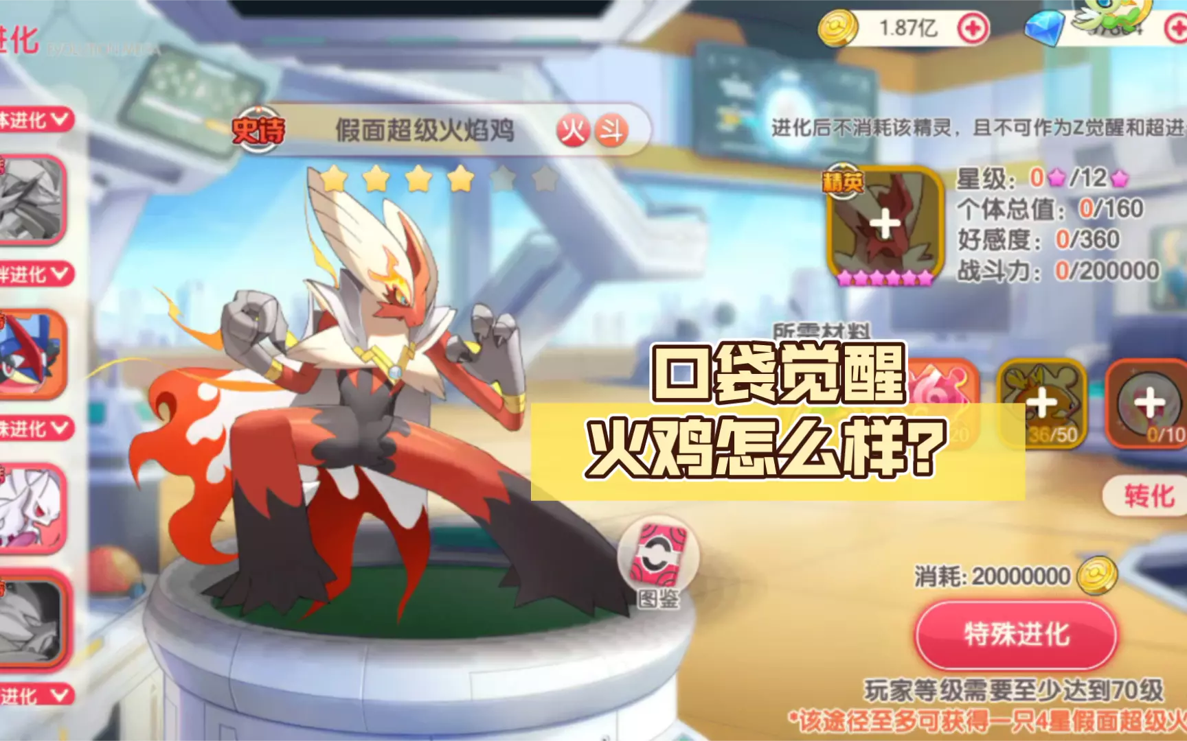 这是手游《口袋觉醒》里关于假面超级火焰鸡的情报解析,它需玩家70级才能特殊进化,后续升星依赖红碎或红色百变怪,培养成本高,淘汰后损耗大,还介绍了它的普攻技能烈焰升龙。