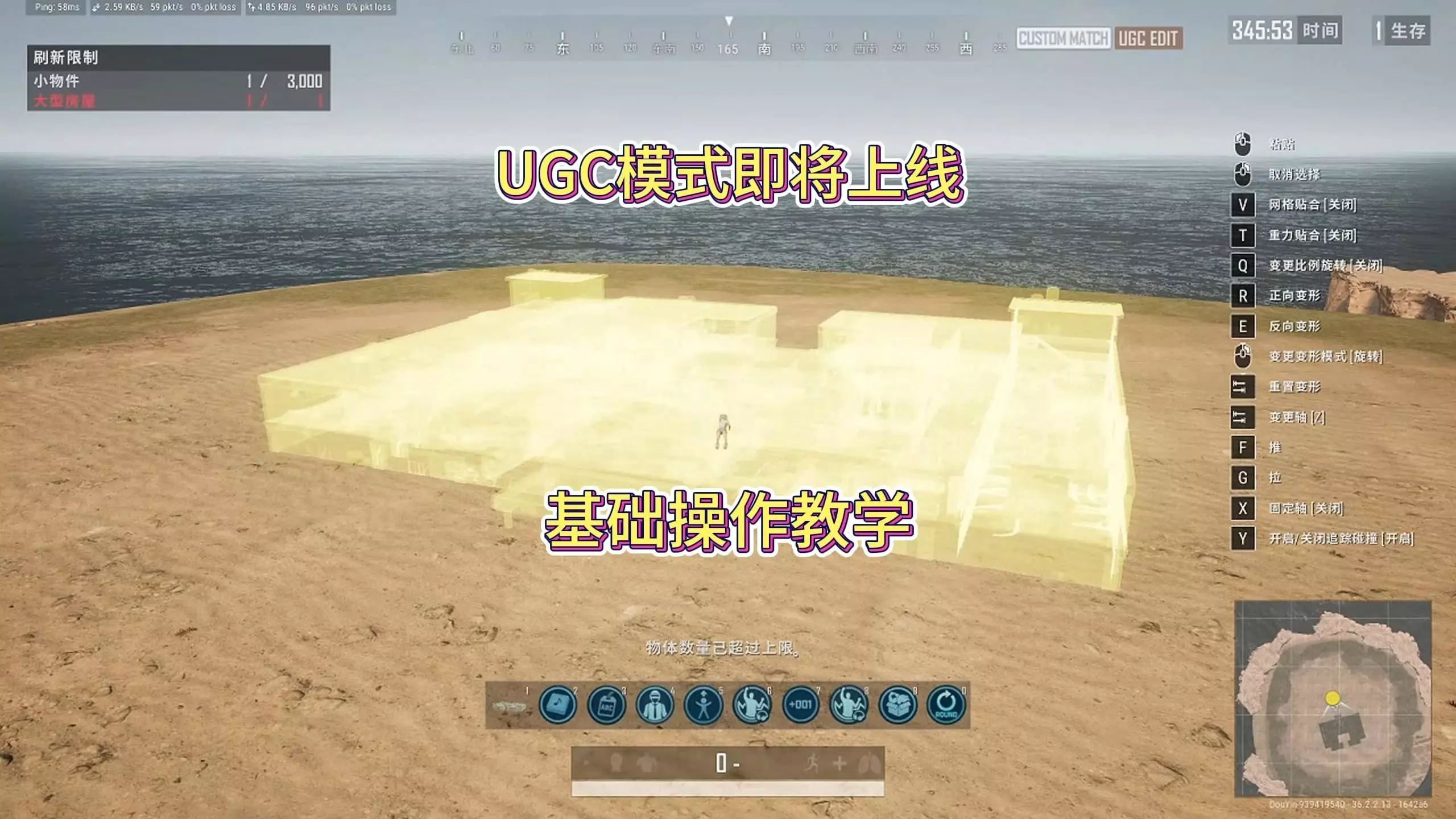 这是《绝地求生》UGC模式的基础操作教学,介绍了按P键呼出编辑管理器选物件、画面右侧实时显示操作提示、多选物体、长按右键切换缩放或旋转模式等操作,还展示了分数管理装置的基础设置,帮助玩家掌握该模式的基础操作。
