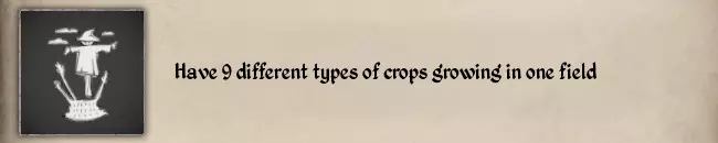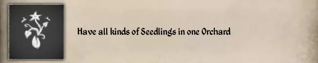 关键在于“可收获状态也有效”,所以你应该先种植黑麦:在秋季规划一块10格的田地,然后在其中一格种植黑麦,另外8格可以先施肥和耕地。接着将时间推进到春季。先不要收割黑麦,让它保持可收获状态,然后播种其他8种作物(甜菜、卷心菜、胡萝卜、罂粟、亚麻、燕麦、洋葱、小麦)。播种完成后你将解锁纹章。 #45 Have all kinds of Seedlings in one Orchard