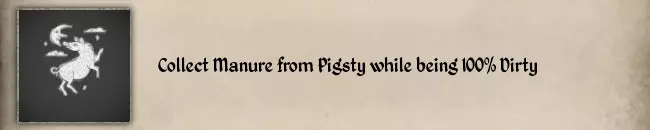 当营养值为0时,你只需饮用苹果汁或其他能持续恢复生命值的食物或药水。这可以与另一个纹章挑战【#12 在营养值为0时猎杀乌鸦】同时完成。 #35 在100%肮脏状态下从猪圈收集粪便
