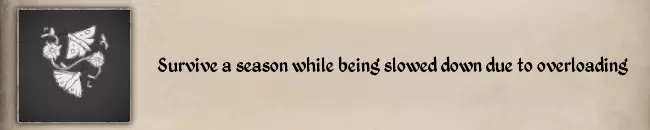 这是一个比较棘手的纹章挑战,至少对我来说是这样。这里有一些小贴士: 1. 你必须在季节变更的前一晚让自己处于超载状态,然后睡觉进入下一个季节。此时你的挑战就开始了。 2. 你可以穿上重型盔甲来增加重量。 3. 卸下并暂时停止使用所有的袋子和背包。使用这些物品可能会让你意外解除超载状态。 4. 避免所有需要大量移动物品的情况(比如在秋季收割庄稼)。 5. 你必须保持超载状态直到进入下一个季节。 6. 完成纹章挑战时不会有通知,你必须去村庄告示牌确认。#11 中毒状态下存活 #23 处于醉酒和中毒状态时使自己摔倒