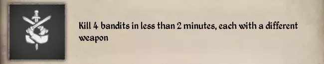我建议你可以同时完成两个纹章挑战,快速存档是你的好帮手。以下是我的技巧: 1. 你需要一面盾牌,或者一把带有推击功能的武器(我用的是铁斧)。喝下力量药水和耐力药水会让完成【#40】变得更容易。 2. 你需要先学会推击,使用推击的方法是在格挡时进行攻击(对于PC玩家,需要按住鼠标右键的同时按下鼠标左键)。 3. 杀死多余的欧洲野牛,只留下一只,这是个好主意,可以避免其他不确定因素。 4. 首先,只需使用格挡并承受公牛的冲撞,直到你看到解锁纹章的提示信息。然后你可以用任何方法削弱它的生命值,直到它开始逃跑,这时你必须追赶它并持续攻击,直至将其击杀。 5. 可以独自完成【#40】,你甚至可以骑马绕着欧洲野牛来完成【#53】,但可能会出现一个BUG,即尽管你已经解锁了纹章,系统却不会提示你已解锁。 战斗相关 【#48】左手持火把时击杀一名强盗 【#51】在2分钟内用不同武器击杀4名强盗 【#55】在战斗中承受150点伤害并存活下来