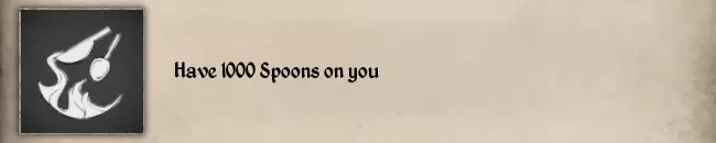 当你拥有技能专长【负重者等级3】且卸下所有腰包和背包时,你的负重上限为50千克,而一根羽毛仅重0.01千克,因此你至少需要5000根羽毛。 #50 Have 1000 Spoons on you