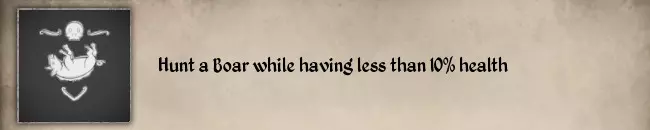 这可以与另一个0营养价值的纹章挑战【#22 Starve】一起完成(处于持续治疗效果下时食物状态等于0)。 #06 在生命值低于10%时猎杀一头野猪