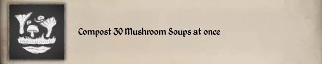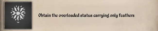 这不仅仅是把东西放进堆肥里,你还得等到下个季节,那些蘑菇汤才会变成腐烂物。当你在下个季节开始醒来时,纹章解锁提示就会出现。 制作30份蘑菇汤的材料是30份肉或30份咸肉、30份牛肝菌、30份伞菌、30份红松菇,以及30个木碗,这些都要在厨房的大锅上制作。 #49 Obtain the overloaded status carrying only Feathers