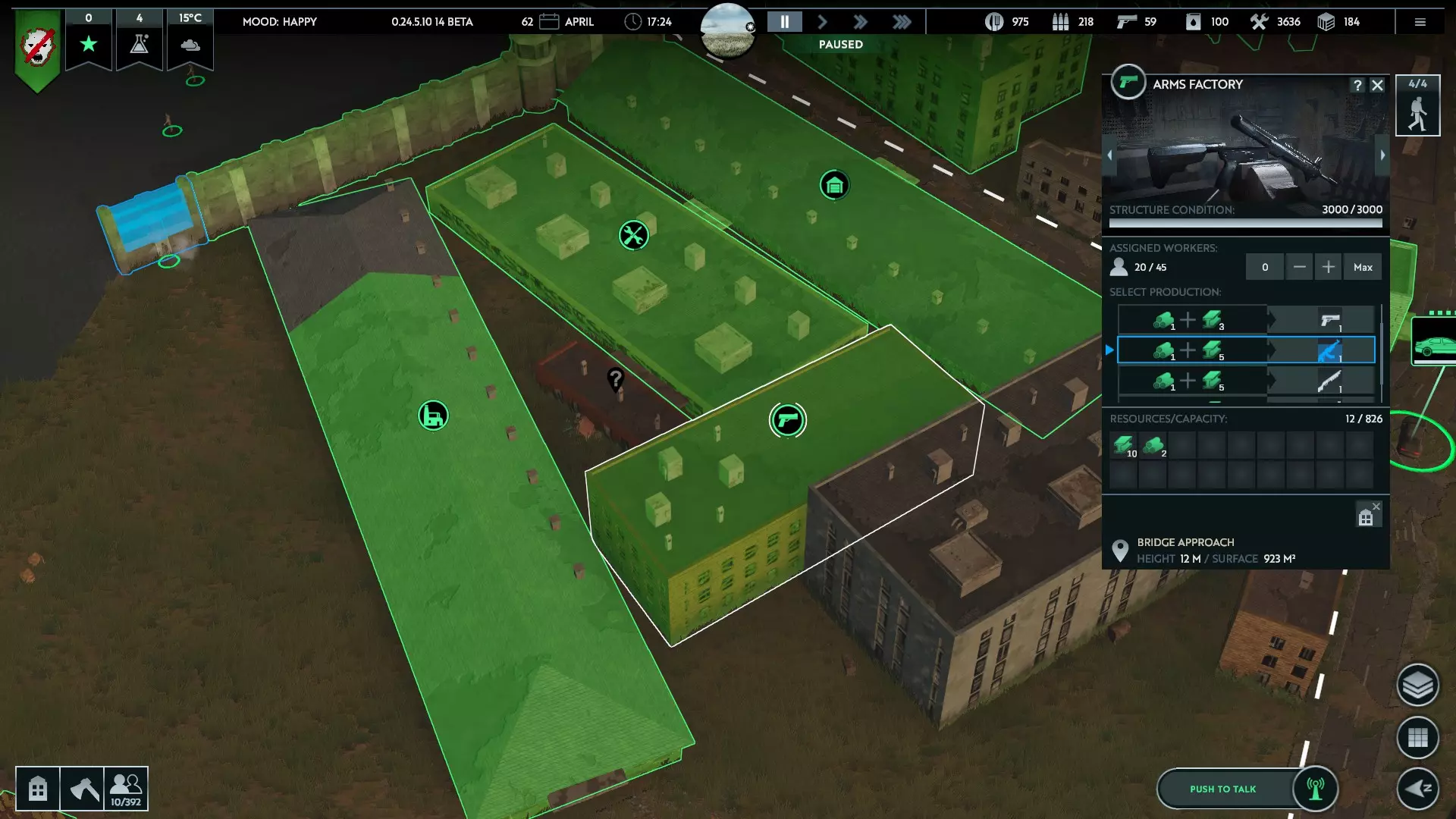 The time taken to complete a production cycle is (mostly) dependant on how many people are working in that building. This scales very simply, as the time taken to produce the resource is inversely proportional to the number of people working on it. Put simply: doubling the amount of people, halves the work time: 1 worker : 40 hours > 2 workers : 20 hours > 4 workers : 10 hours > 8 workers : 5 hours etc. Eventually you get marginal returns, so it ends up being better to have multiple of the same building rather than 1 super building with the same amount of workers. Tips Efficiency is affected by mood; the best way to maximise production is provide everyone with houses, brews and childcare, as this makes them happy and gives a flat 40% boost to ALL production. Can't stress enough, this is huge The number of people that can be assigned to a building depends on it's size. Bigger buildings = more people = faster production. Only the fields are set at 2 people max Speaking of fields, their efficiency will also be affected by temperature, dropping by 80% in winter - this is mitigated to 40% drop if everyone is kept happy (their positive attitudes thaw the fields) Production time is specifically when people are working; a rifle that needs 24 hours to be built will take 3 days (assuming 8 working hours per day). Workers only come out during the day for safety, Workers take precious time to walk to their workplace, so fields and factories should have homes nearby to get the most productive time out of workers - and don't have water between them, as workers will path straight through water and not across bridges/around the water Food Production Chain Given the details in the above section you can work out what number of workers and resources you need for production of certain things, but I've taken the liberty of detailing two example food production chains for a zone of 100 survivors - one for grain rations, one for meat rations - since there's multiple steps and factors that complicate it. You can then multiply this for the number of survivors you have Each different option presumes base level production efficiency (no bonus or malus), and 8 working hours a day. Exact maths gives fractions of production cycles, so these have been rounded up to leave some margin for extra production. As the greenhouse has the same base production as fields, you can use them interchangeably here (with less need for margin-for-error if you use greenhouses, as they're not affected by the cold) GRAIN No research 9 Fields: 18 workers - N/A > 10.8 grain Cookhouse: 13 workers - 10 grain + 5 wood > 20 rations Cannery: 5 workers - 18 rations + 9 metal > 27 canned food All research 7 Fields: 14 workers - N/A > 11.2 grain Cookhouse: 10 workers - 10 grain + 5 wood > 20 rations Cannery: 5 workers - 18 rations + 9 metal > 27 canned food No research (fertilizer) 3 Fields: 6 workers - 1 fertilizer > 10.8 grain Cookhouse: 13 workers - 10 grain + 5 wood > 20 rations Cannery: 5 workers - 18 rations + 9 metal > 27 canned food All research (fertilizer) 3 Fields: 6 workers - 1 fertilizer > 10.8 grain Cookhouse: 10 workers - 10 grain + 5 wood > 20 rations Cannery: 5 workers - 18 rations + 9 metal > 27 canned food MEAT No research 5 Fields: 10 workers - N/A > 6 grain Barn: 11 workers - 6 grain > 12 meat + 6 fertilizer Cookhouse: 8 workers - 12 meat + 4 wood > 20 rations Cannery: 5 workers - 18 rations + 9 metal > 27 canned food All research 4 Fields: 8 workers - N/A > 6.4 grain Barn: 11 workers - 6 grain > 12 meat + 6 fertilizer Cookhouse: 7 workers - 12 meat + 4 wood > 20 rations Cannery: 5 workers - 18 rations + 9 metal > 27 canned food No research (fertilizer) 2 Fields: 4 workers - 0.8 fertilizer > 7.2 grain 11 workers - 6 grain > 12 meat + 6 fertilizer Cookhouse: 8 workers - 12 meat + 4 wood > 20 rations Cannery: 5 workers - 18 rations + 9 metal > 27 canned food All research (fertilizer) 2 Fields: 4 workers - 0.8 fertilizer > 7.2 grain Barn: 11 workers - 6 grain > 12 meat + 6 fertilizer Cookhouse: 7 workers - 12 meat + 4 wood > 20 rations Cannery: 5 workers - 18 rations + 9 metal As you can see, the most efficient method is using a Meat production chain with fertilizer, as this gives a net gain in fertilizer which can be used for fuel and ammo production, and uses the minimum number of workers (26 to feed 100) - but is the most complex Efficiency will drop during winter as the fields produce more slowly, but with the 40% boost for happiness (from building Houses) and the margins for extra production, it's very easy to quickly build up a surplus of food Shout out to Raven's guide on food production calculations that helped to lay out this example. People You'll start with a group of survivors who have managed to hide and wait out the end times with you (exact amount depending on the option chosen at game setup). These people make up your squads and workers, and will be reffered to collectively as citizens. Treat them well - they could just be the future of humanity. Keep in mind, you're likely (and hopefully) not the only people still around by the time the all clear is given, and you'll need help to grow your zone and rebuild society. At least anyone still alive is likely to be immune... right? Squads These are micro-managed groups of up to 4 people, who carry weapons and equipment, and each have 1 inventory slot - a squad of 4 will have 4 slots (as well as their weapon and equipment). They are sent to scavenge in buildings for supplies, scout out what's left of the world around your zone, and fight hostiles. The number of squads you can field is determined by how many HQs and Squad quaters you have, which each increase the capacity depending on building size. It's inevitable that they will see conflict, so managing squad equipment is important to their survival and success. They will auto equip any weapons/equipment they find when scavenging or entering warehouses, but you can use the "transfer" option on a warehouse/HQ to swap out 