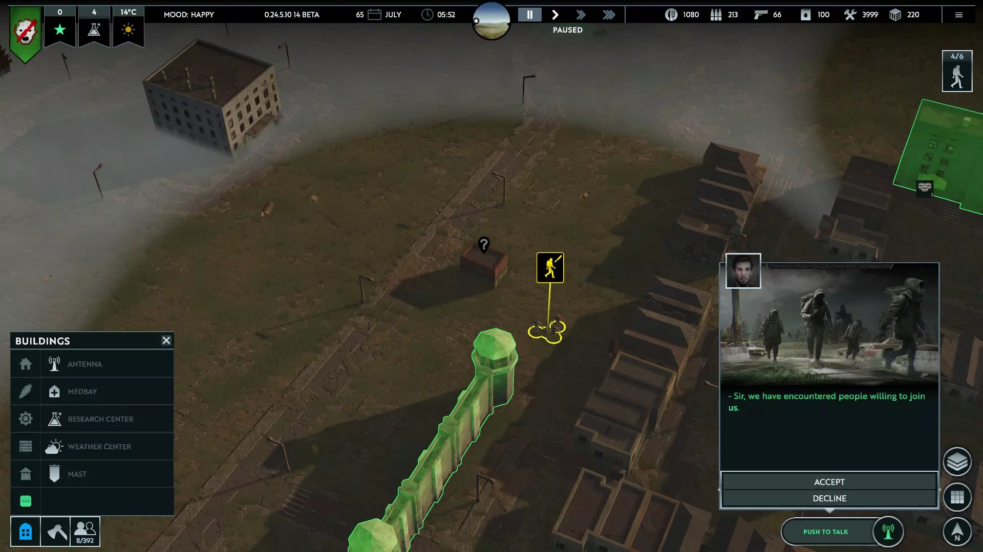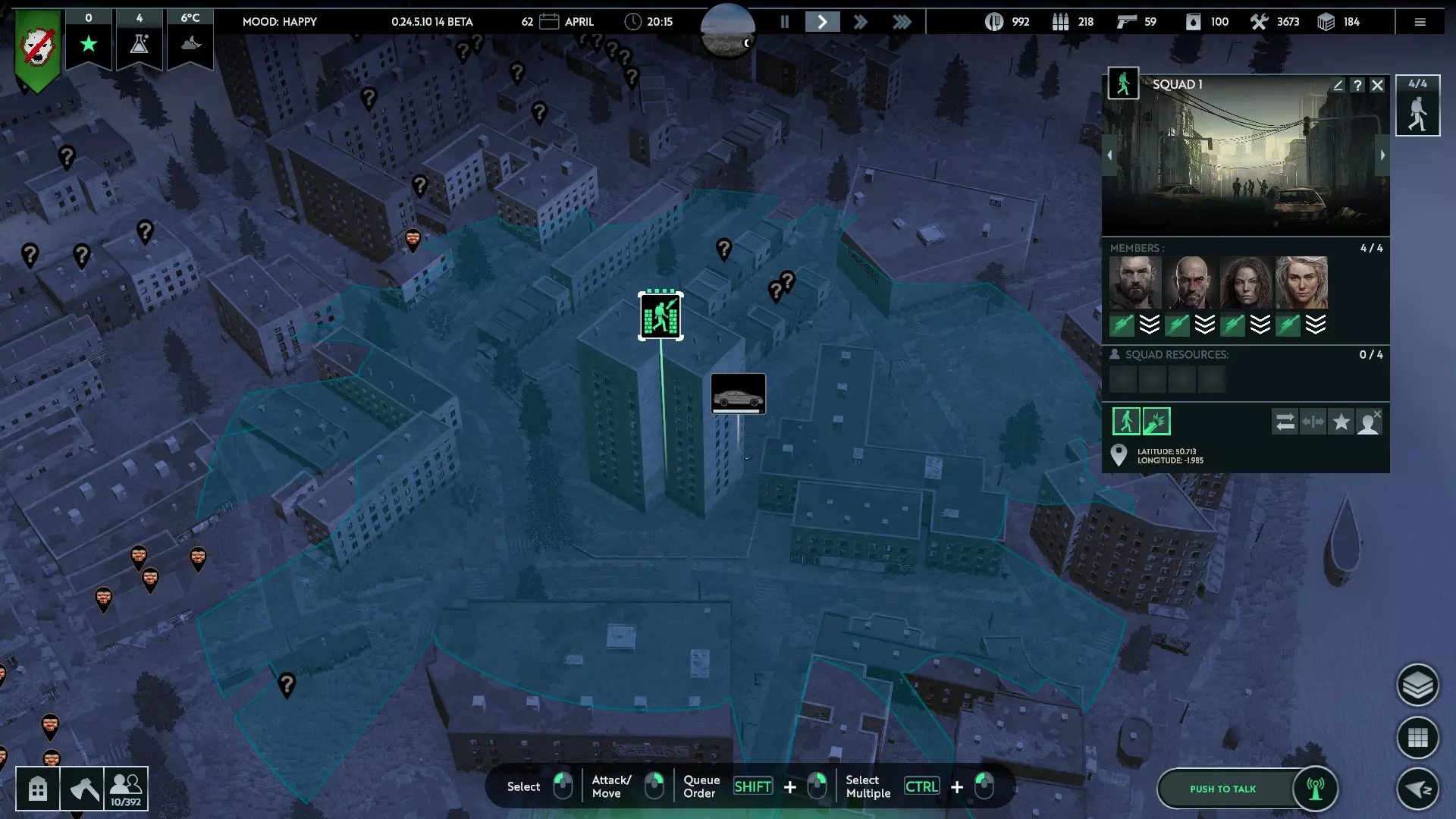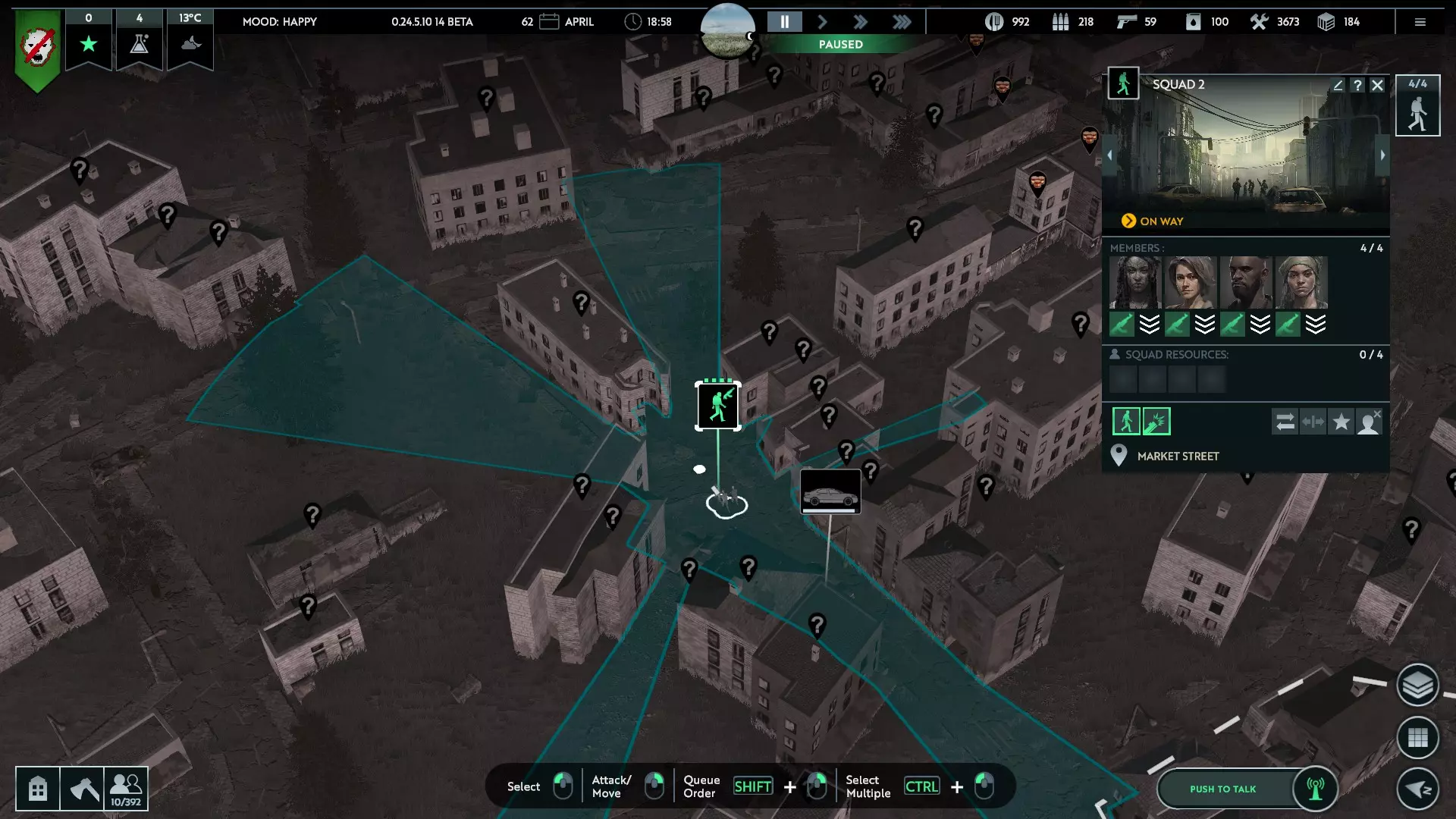 Units have to enter buildings through entry points, the number of which depends on the size (larger buildings having more). You can see where these are based on where your squad will path to, if told to enter the building. Keep this in mind if they are running from hostiles - it might just be safer for them to go to a further away building where the door is closer Squads can now move around inside buildings. This is shown by their path turning blue, with a small x to show their stop. Make sure your squads are near the edges of buildings to have enough range to hit outside targets Combat TacticsFight Smart: this goes without saying, and takes experience to get good at. Don't fight infected in melee when you can hit them from range. Stay out of the line of sight of raiders with guns by hiding behind buildings, until you can engage them from within a building where you have cover. Infected run faster than your squads can on foot - make sure they stay far enough ahead to get to a safe spot. Fortress: the idea of building up walls, towers, gates and barbed wire to protect your zone and direct hostiles to a specific area to fight back. Obviously resource intensive, but with careful planning and a good choice in area it's possible to make strong defences, especially if you can get squads in high buildings to bring more firepower to bear in specific spots Hit & Run: using at least 2 squads equipped with vehicles, have one stopped (and exiting the vehicle to remove the -30% aim malus) to fire at approaching infected while the other squad speeds ahead to get out and prepare to shoot. Micromanage intensive to stay ahead of melee, but this leapfrogging will let you do damage safely for as long as ammo holds out (though well prepared Operators will store ammo in the vehicles, to resupply the squads). Kiting: if a group or swarm of infected is large enough to overwhlem your zone or a specific defensive point, you can use squads in vehicles to approach the swarm just close enough to draw off some the groups, so that your defences can handle a few at a time. One squad can also kite infected around a building manned by other ranged squads, that can fire on the infected without fear of them storming the building Hunt & Clear: infected will hide during the day, usually in buildings but also occasionally in the ground. Though you can't do much if they bury themselves, you can clear them out of buildings quite easily by sending squads in. Overwhelming firepower is good - multiple squads can be sent in at once. If a swarm is too big to fight in the night, you can clear them group by group during the day to stop them overwhelming your walls that night Building peeking: this is a cheesey tactic, but infected will hide in the centre of buildings - for very large ones, it takes time for them to come to the entrance your squads enter, giving the squad time to shoot (all buildings are treated as hollow for line of sight). When the infected get close, your squad can step outside and let them crawl back into their nest, to avoid damage. Very micro-managey and feels a bit like cheating, but you could explain it away as squads luring the infected out of buildings or into ambushes inside, you do you Weapons Weapon Damage Attack speed Damage/sec Range Ammo capacity Notes Melee - Default 35 1.3/sec 45.5 0.6m N/A Default, and fall back if ranged weapon runs out of ammo Meelee - Polearm 55 2.5/sec 137.5 5m* N/A More advanced melee weapons that do a lot of damage, but put your survivors at risk Bow & arrow 20 0.6/sec 12 45m N/A Only available for tower/gate workers, but uses no ammo Pistol 35 0.6/sec 21 50m 50 Basic and abundant ranged weapon Assault Rifle 105 0.3/sec 31.5 75m 70 Claims to have less chance to hit, so best assigned to experienced survivors Shotgun 80 0.6/sec 48 60m 30 Possibly has better effectiveness indoors, but needs to be confirmed Sniper Rifle 200 0.3/sec 60 110m 25 Enough damage to one hit most infected/people, but expensive *This range is estimated based on the range shown when hovering over your squad icon when equipped with polearms, as the game now only says "short" for range. They are still vastly better than default machetes Vehicles Your squads will find old, pre-pandemic vehicles scattered throughout the region. Not many can be recovered due to deterioration, but those that can are invaluable for developing your zone and rebuilding society. Vehicles are recovered by moving a squad on to them, and take a moment to get running - the squad will then be attached to that vehicle until you specify otherwise, and will use it when moving around anywhere outside. Each one has 4 seats, to fit a full squad, but will have variable other stats - hit points, fuel, storage, etc.The chart below lists their details; each vehicle has a specific max speed, acceleration rate, and fuel usage which can be seen by hovering over the stat bars, but I've narrowed these down to general "speed", since it gets a little min-maxxy for this guide otherwise - but the info is there if you want it. "Use" is also fairly subjective, your mileage may vary (pun intended) Vehicle Hit points Fuel capacity Storage Speed Use Compact 300 2 4 Fast Weak, tiny, only really good for moving a squad around quickly Sedan 600 3 10 Fast Small storage, but relatively common Combi 700 3 15 Fast Less common, and slightly more storage space - not as cool though Pickup 800 4 20 Medium Classic utility vehicle, and fairly common compared to "better" vehicles, albeit slower Van 1000 5 25 Medium Better for longer scavenging runs, thanks to the bigger storage and fuel tank Truck 2000 6 40 Slow Aside from being slow as hell, the ideal workhorse for scavenging and expeditions Tanker 2000 20 4 Slow An old fuel truck that somehow still has fuel in it - useful for stocking up your zone, or taking fuel out to multiple vehicles that have run dry far from home Armoured vehicle 30000 12 10 Slow An incredibly strong IFV, slow and low storage mean it's not great for s