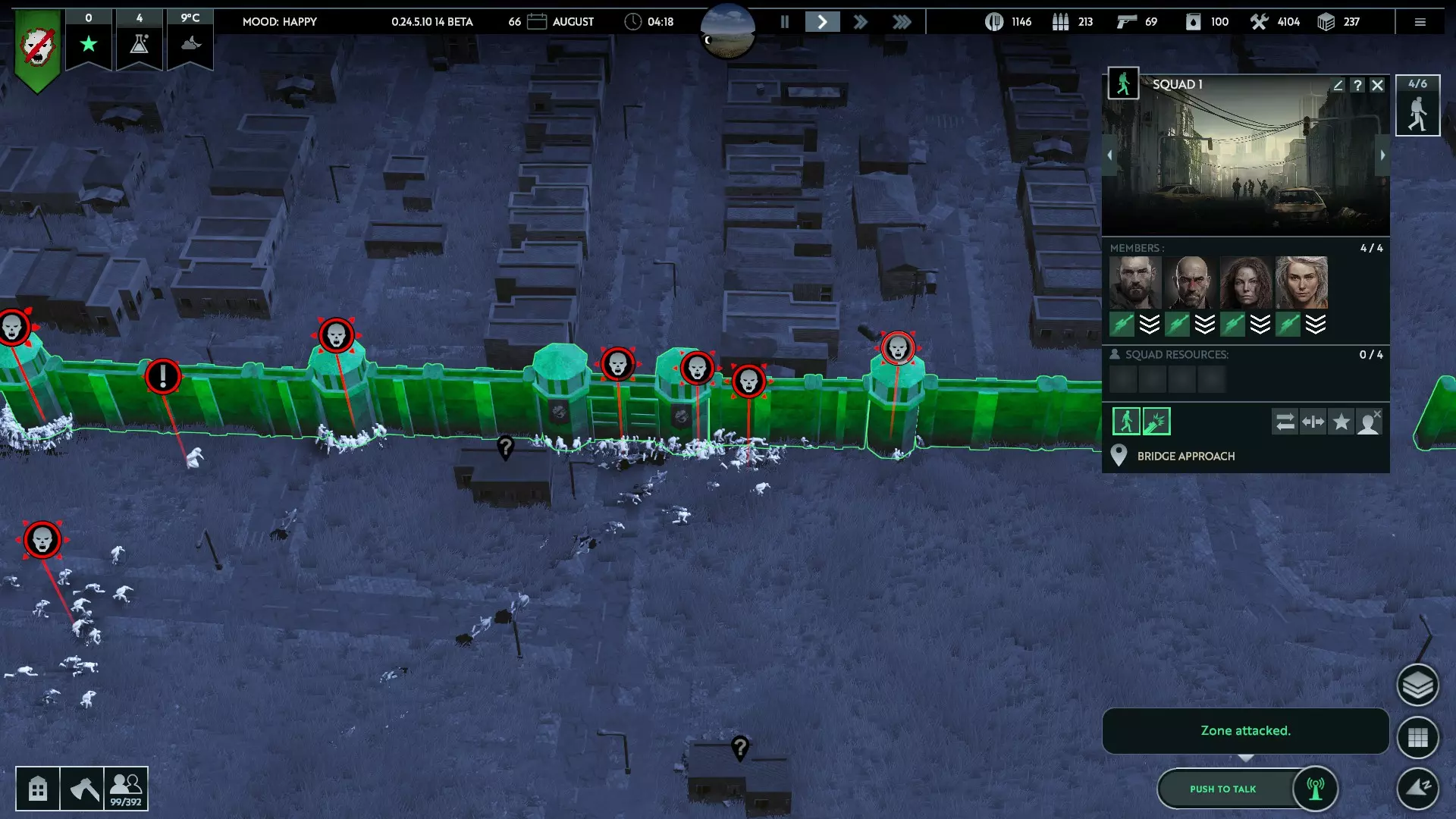 More built up areas (cities, large towns) will have more infected to deal with - dependant on the setting chosen in game set up - but more buildings and thus more supplies. Inversely, smaller areas may not have enough buildings or supplies to get by. You'll need a variety of supplies to survive and thrive, so make sure local areas have the variety of buildings (food, tools, security supplies, etc.) you'll need. Each square seems to be around 1 square kilometer, so you can use other tools like Google Maps to look for good locations and then find them in game (as the in-game map loads somewhat slowly and buggily) Make sure there are appropriate buildings close by: this is one the most important points. Your HQ should ideally be in a small building, with a variety of small to large buildings around it. This is because the HQ is severely limited in how much space it takes up at game start (to prevent super easy starts with a tonne of shelter and storage space), and you'll want smaller buildings to start your zone with decent options to expand to. If there aren't enough close by, you could have to grow your zone very large quickly, just to get set up, and then struggle with defence (see Buildings section for more) Infected are seen to have an incredible ability to swim; even zones on islands or mostly surrounded by water are likely to fall under attack from the water. However, bridges or thin spits of land can act as effective bottle necks, and swimming will slow the infected down to be more easily picked off from a distance (when the water is not frozen over) With the latest update location on the globe will now affect the climate of your zone. Ergo, zones closer to the equator will be easier, as the productivity of farms will be less affected, and winters are less likely to freeze water Weather & Time The seasons will pass and the weather will change from hot to cold and back, and in addition the times of sunrise and sunset will also change. This is critical, as the infected are averse to sunlight. They will hide during the day, and come out at night - this naturally makes days safer, and nights more hazardous, with some exceptions. Heavy storms can give enough cloud cover to let the infected step outside during the day On the clearest nights, the reflected light of a full moon can cause the infected to continue hiding, giving you a reprieve - though they tend to come back twice as hard the next night. As winter sets in, the shorter days will mean less sunlight for your workers, and the lower temperatures will reduce the effectiveness of your farms. It can also cause water to freeze, allowing fast movement over rivers and lakes; for both survivors, and the infected. (Currently temperature doesn't affect survivors - no heating needed, squads don't get cold) Time also passes in the game specifically; each day lasts a month (and so a year lasts 12 days). As such winter might sneak up on you, so make sure to prepare for the cold. Fog of War You'll only be able to see a small area around your zone, specifically around your squads, workers, and owned buildings. Squads will be critical to explore the region around your new zone, for locating useful supplies, vehicles, groups of survivors - and for spotting infected. Sometimes a heads up of incoming swarms will be the difference between fighting them off successfully, or falling to the horde. Expeditions The area around your zone will be made up of 9 map squares, with your HQ (and most of your zone) inside the central square. This main area is where buildings, NPC, infected etc. will spawn and where you can scavenge/fight in view. Beyond this is the rest of the region around your area, which can be accessed by squads to gather supplies without the micromanagement of choosing individual buildings, and can be done by zooming out enough to see the map view. Squads can sometimes face infected or hostiles in these expedition zones, and so need to be kept an eye on. They can only be directed to leave that square, not micromanaged in combat. Buildings (general) Adapting Your relatively small zone won't have the heavy equipment or supplies for new construction (at first), and so will have to rely on adapting existing buildings to suit their needs. Many of these will require you to find equipment (exploration locked) or rediscover lost techniques (research locked). There are a number of different adaptations you can make: Headquarters: this is where your zone is commanded from, squads are created, and houses a few people and can store some resources. Extra HQs can be set up, which can work well as forward bases for scavenging/dismantling Warehouse: stores resources, fairly cheap to build, and is where workers will bring and pick up resources Shelter: a basic home for survivors, enough to keep people content (as long as there's enough room) House: a more advanced, comfortable home with creature comforts. More expensive, but makes people very happy (research locked) Squad quarters: a safehouse which generates more Squad slots (see Combat section below) Field: requires open space instead of a building, produces food but has lower effectiveness in the winter and cold months (exploration locked) Barn: keeps animals for raising, producing meat and fertilizer (exploration locked) Cookhouse: turns grain or meat into food rations, using wood as a fuel source Cannery: turns food rations from the cookhouse into canned food (research locked) Greenhouse: similar to a field (requires open space instead of a building), with same basic production stats but unaffected by temperature - weaker and more expensive as a downside (research locked) Tool factory: uses wood and metal to create tools (research locked) Arms factory: uses wood and metal to create weapons (research locked) Chemical factory: creates fertilizer out of wood/fuel, and fuel out of wood/fetilizer (research locked) Protective Gear Factory: a place to make protective equipment for your squads (research locked) 