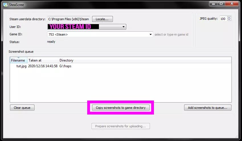 注意:Steam的ID为753,青睐之光的ID为765。只需将截图拖放到该区域,然后点击【将截图复制到游戏目录】。