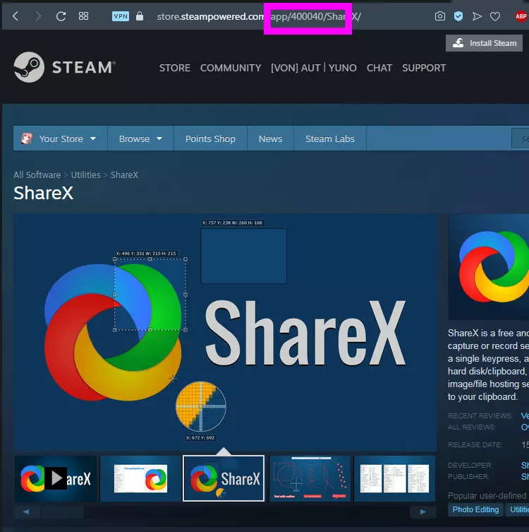 现在获取你的游戏ID。例如,打开Steam,找到你的游戏,获取标题前的数字。我以ShareX为例进行演示,但此处的“游戏”指的是Steam。