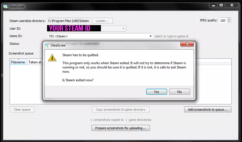 不一定非要通过任务栏退出,你也可以在Steam内退出。点击左上角的【Steam】,然后在底部点击【Exit】,选择你喜欢的方式退出即可。 快完成了。只需点击【Prepare screenshots for uploading...】