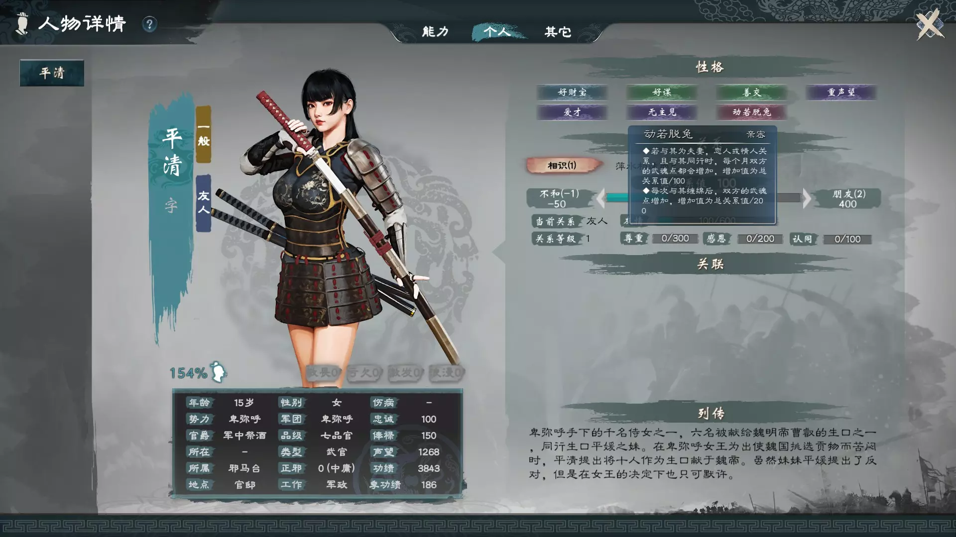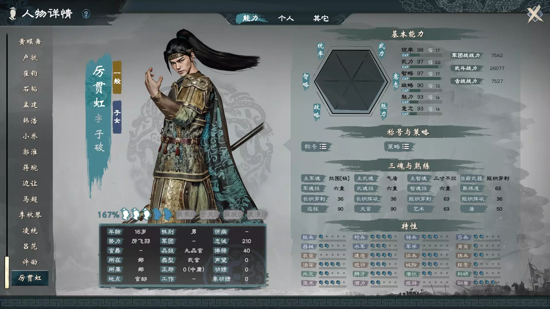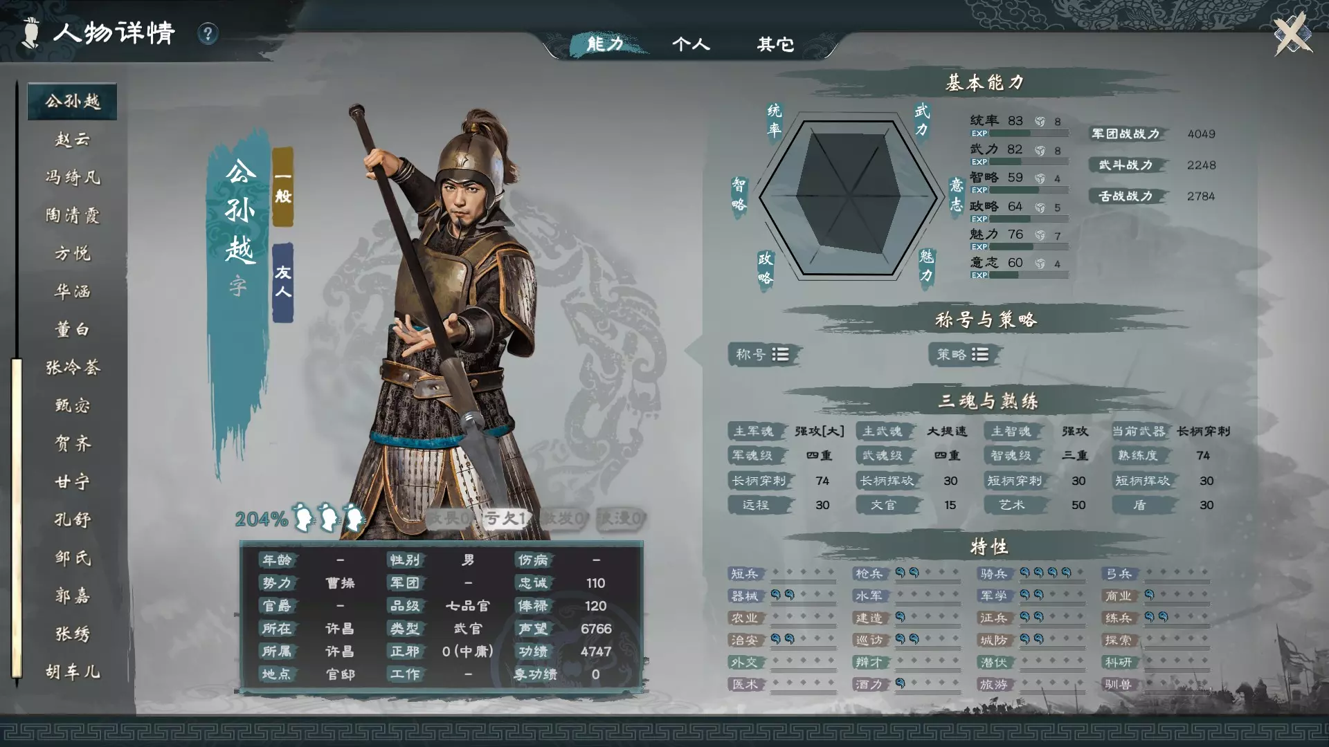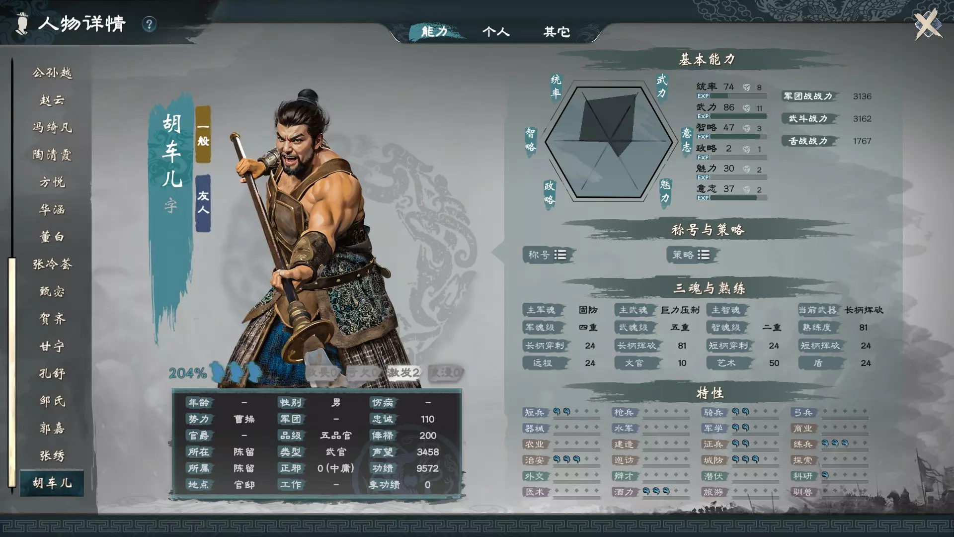 静如处子可以每月帮忙增加智魂,进行房事还会额外增加。 动如脱兔可以每月帮忙增加武魂,同样房事也会额外增加。 巾帼英姿可以每月帮忙增加军魂,房事自然也会额外增加。 把她们追到手并结婚带在身边,月月相处照顾,关系提升后增加的数值会更多,所以进入剧本后不要急于求成见到女性就乱花钱,资源有限,必须先重点投资在拥有这三种特质的人身上。 若不喜欢每个月要依次宠幸妻子,也可以创建一个拥有全部粉系特性的新女性角色来当妻子,可以一次性搞定三魂的提升,这样虽然比较简单,但可能会使游戏体验到中后期时缺乏与其他真实历史人物互动的参与感。 如何追妻子