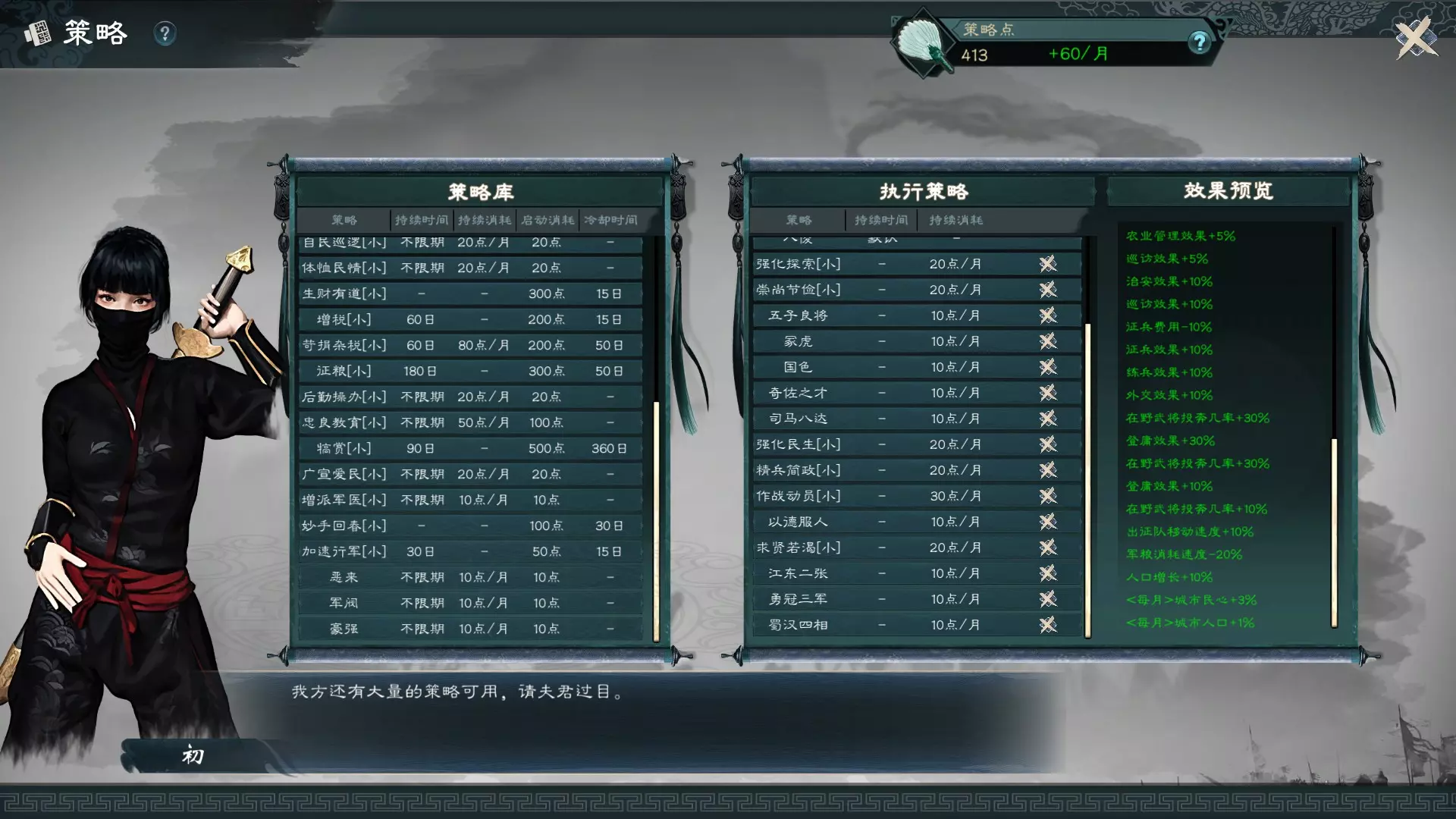 称号与策略称号通常带有特定的辅助效果,有些则带有特定的策略效果。不同类型的辅助效果可以叠加,但同类型的只会升级为最高级的,例如【天赋绝伦】升级成【神造之才】。而策略是治理方针,成为君主后可以在内政策略中选用,可为整个势力的城池或部队带来相应的策略效果。