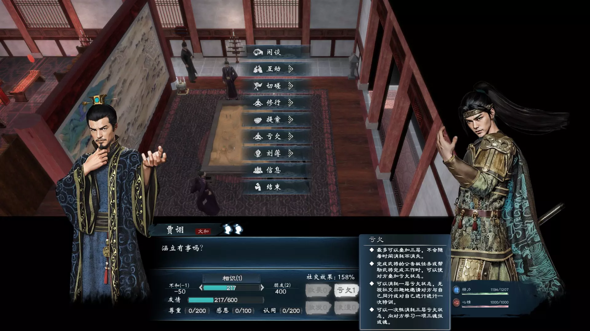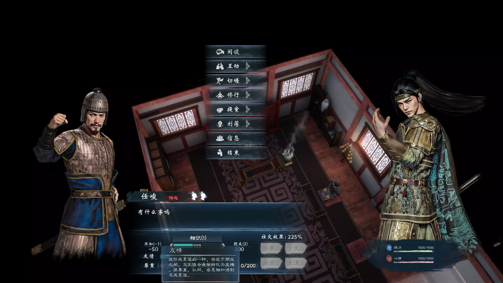 第三,若对方对你持有敬畏之心,也会影响接下来你与他的互动,会有一定程度的增加。因此,就玩家偏好的名将、老婆来说,通常都有好谋、好兵或好武的特质。由于首次切磋能给予敬畏效果,所以人际互动第一次见面深交的起手策略就是: 好谋是吧?我先骂哭你。 好武是吧?我先揍哭你。 好兵是吧?我先翻桌子。 真是优秀的人际关系经营起手式啊! 具体流程如下: 先使用洞悉之符探查对方底细,若洞悉之符不足,使用后可重新读取存档。 接着选择一个能触发激发效果的轻松话题,一方面增加友情值与认同度,另一方面触发激发效果。如果对方有正邪倾向,可以选择正邪相关的话题;如果对方喜好饮酒,可以选择饮酒话题;如果对方追求享乐,也可以尝试旅游话题。总之,要先用轻松的话题来激发对方。要是对方性格难以相处,可以请他喝能触发比武、辩论或兵棋推演的酒,这也是迫使他产生敬畏的方式。 如果对方有两个“喜好”,可以选择大话题来触发两个激发效果;如果只有一个“喜好”,用中话题触发一个激发效果即可。 获得激发效果后,切磋不会消耗社交兴趣。此时可以根据对方的“喜好”,通过骂哭、揍哭或掀桌子等方式,来提升敬畏层数。 有了敬畏之后,再谈论对方喜好的严肃话题,一方面可以增加友情值和尊重度,另一方面准备送礼来恢复此次消耗的两个社交点数。送礼时,针对目标对象喜好的类型选择贵重礼物赠送,直到感恩值充满。之后若只需恢复社交兴趣,就不必送贵重礼物,选择合适的即可。 有时若有时间压力,洞悉之符就能派上用场。使用洞悉之符不会消耗送礼次数,还能增加一定的友情值。 完成以上步骤后,总关系值基本能超过或接近1000。如果手头有义理话题或爱情话题,且急于让对方成为家将,可以存档后尝试使用。若结缘失败想重新尝试,记得不要单纯读档,要在中间穿插一些其他操作,比如先邀请对方加入家族,被拒绝后再使用话题,或者先去喝酒再使用话题。游戏的随机机制需要这样来改变,可以多尝试几种方式。 每月切磋只有两次机会,用完后需要等到下个月才能恢复。 以上内容原本放在“重要小事”里,但考虑到有必要单独说明,就单独列出来了。 重要小事:神秘老者是游戏中重要的地图NPC,会出售爱情话题。目前爱情话题暂时无法通过读书获得,想要更轻松地结缘可以依靠他。