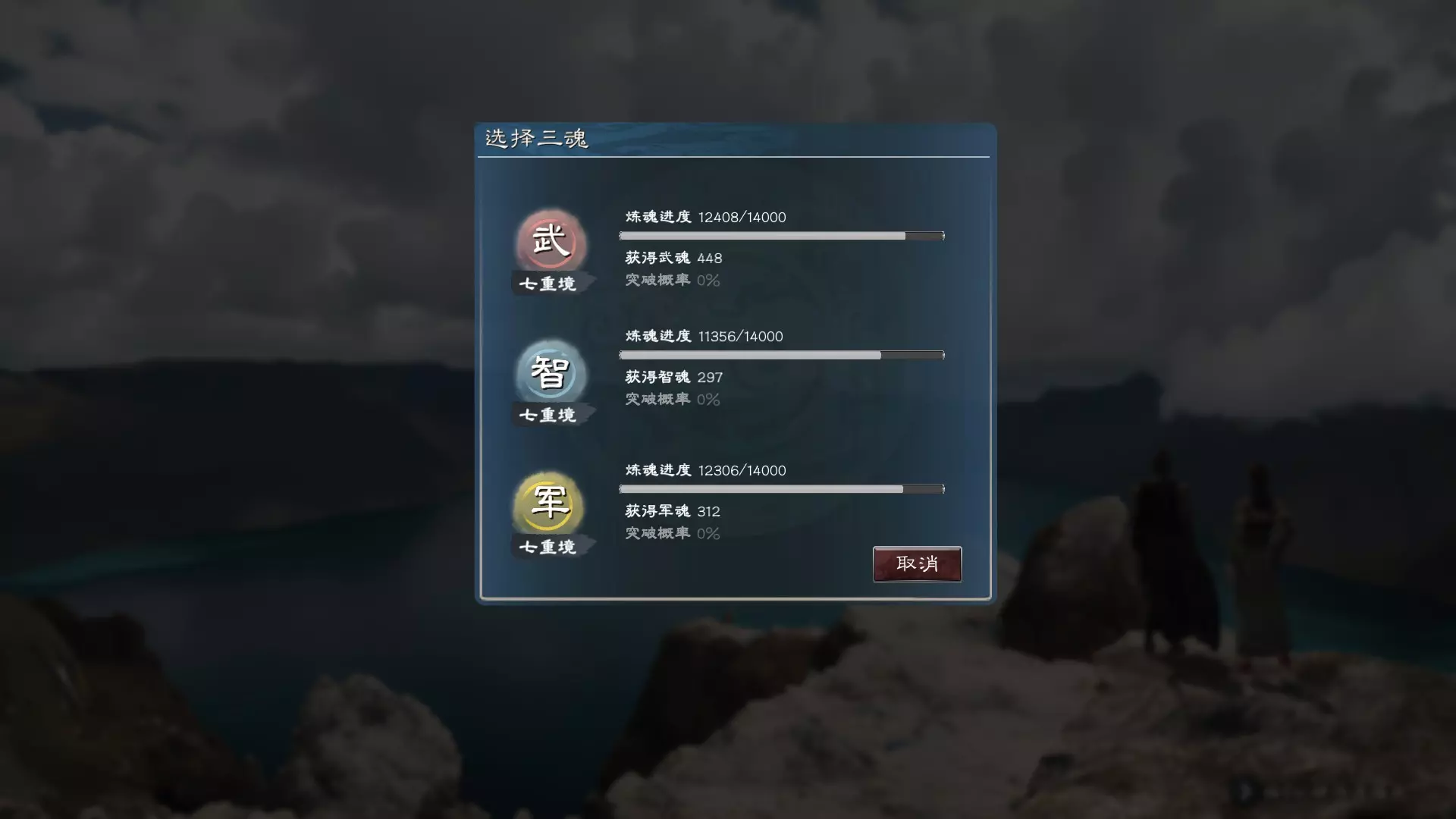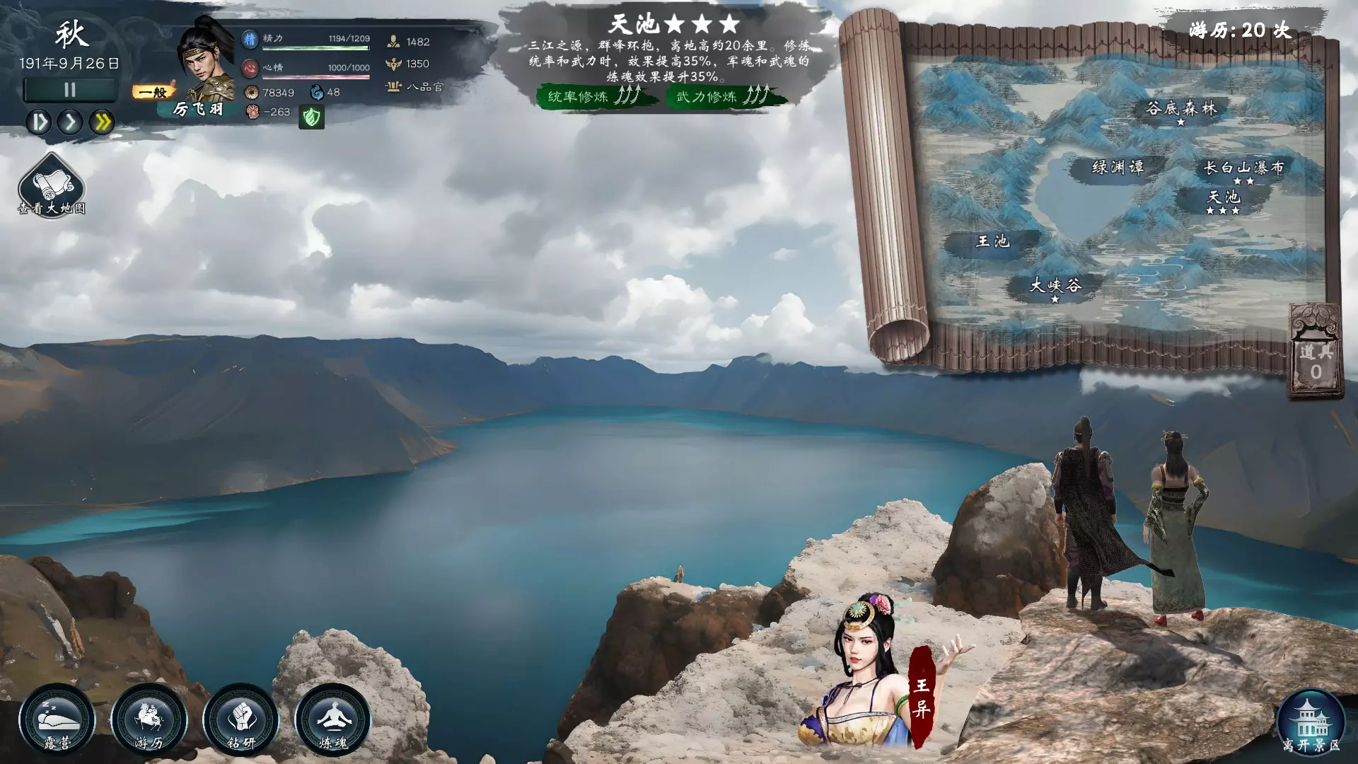 在著名景点历练时可以发现适合修炼的特殊地点,例如长白山天池会特别加成统率、武力、军魂与武魂的修炼,再加上发现地点激发灵感的加成,此时修炼效率会大大提升。武魂修炼值可达到448。