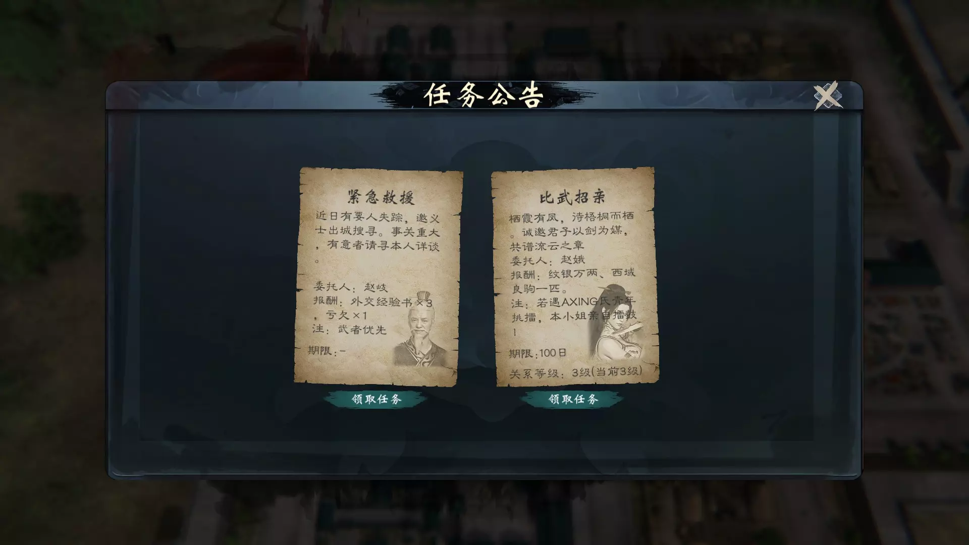 比武招亲应该是特定女性NPC独有的事件,可能只有赵娥会触发,需要满足两个条件: a. 女方年龄已满25岁,未婚。25岁这个数字在demo时期的说明中见过,但正式版未再留意。另外,游戏设定中开启隐藏年龄应该不影响。但无限寿命的新入局者都会停留在18岁,7年后是否会触发该事件未知。 b. 与对方关系达到好友(3)。 满足上述两个条件后,在城镇布告栏内会触发比武招亲任务,接取任务后有100天内完成的期限,整个过程会给予900点武魂点数,若有瓶颈卡着记得先突破一下。