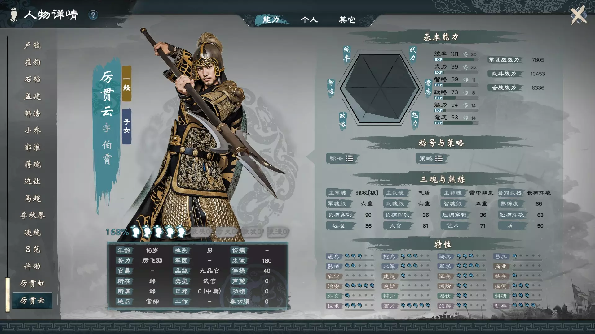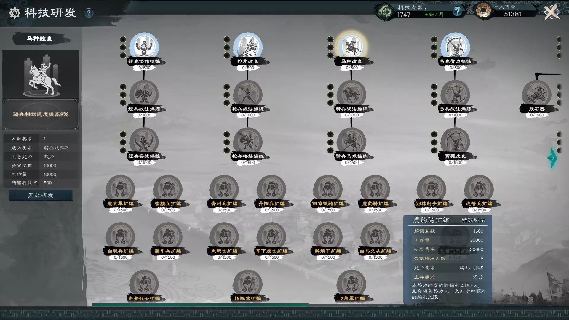 而文武官员读书有其门槛要求,例如想看《孙子兵法》需要统率与智略达到85,想看《青囊书》需要意志85等,诸如此类以此类推。 普遍来说,各种特性一般都有两款不同书名的书籍。以下列出各等级所需六维要求: 普通等级,谓之节选,读书需要特定要求六维40。 良好等级,谓之手抄,读书书籍特定要求六维55。 优异等级,两颗白星,读书需要特定要求六维70。 传奇等级,三颗黄星,读书需要特定要求六维85。 于是这里针对科技研发的需求,依序列出科研所需之优异与传奇品质的书籍与要求,其他的需求如外交、医术、驯兽、辩才等不在此列。以下列表前一本是优异品质,后一本是传奇品质。 短兵特性:需要统率。相关书籍有:步兵操典(短兵)、叠甲论(短兵)。 枪兵特性:需要统率。相关书籍有:枪兵精要(枪兵)、千锋破阵枢机(枪兵)。 骑兵特性:需要统率。相关书籍有:游骑侦训(骑兵)、祁连兵略(骑兵)。 弓兵特性:需要统率。相关书籍有:贯鹄兵鉴(弓兵)、养由基箭谱(弓兵)。 器械特性:需要统率。相关书籍有:鲁班书工匠篇(器械)、鲁班书(器械)。 统率特性:需要统率。相关书籍有:黄石公三略(统率)、吴起兵法(统率)。商业特性:需要意志或政略,相关书籍有:计然之书(政略)、货殖列传(意志)。 农业特性:需要政略,相关书籍有:夏小正(政略)、氾胜之书(政略)。 城防特性:需要武力,相关书籍有:墨子城守备穴篇(武力)、墨子城守备水篇(武力)。 巡访特性:需要魅力,相关书籍有:神农二十篇(魅力)、汉书艺文志(魅力)。 治安特性:需要武力,相关书籍有:军志(武力)、司马穰苴兵法(武力)。 从上述列表中,我们可以得出一个培养文武官的要点: 想要进行科研需要依照个别特性来培养文武官,令其阅读该特性的书籍。要阅读这些书籍需要培养基础六维属性。提升科研特性需要智略,因此所有文武官员最终都会提升智略。以下是培养基础六维与科研的书籍,前一本为优异品质,后一本为传奇品质: 统率:黄石公三略(统率)、吴起兵法(统率) 武力:论语(武力)、黄帝内经(武力) 智略:九章算术(智略)、庄子(智略) 政略:孟德新书(政略)、吕氏春秋(政略) 魅力:汉赋(魅力)、诗经(魅力) 意志:列女传(意志)、史记(意志) 科研特性:黄帝纪要(智略)、算罔论(智略) 最后,家将培养还需要征召私兵与练兵。征兵特性:商君书兵守篇(统率)、商君书(统率) 练兵特性:尉缭子经卒令(武力)、尉缭子(武力) 驯兽饲养、私人土地、景点修炼 关于宠物系统