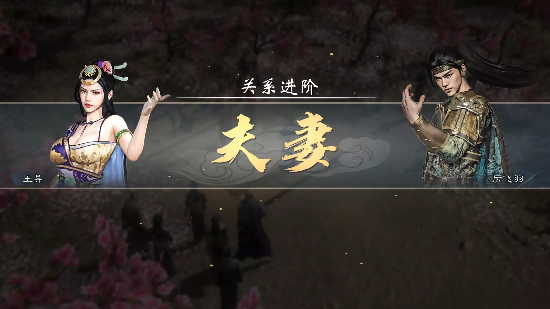目前版本中提升好感度非常容易,时间可以缩短到半年就能成婚,具体流程如下: 找到目标人物并了解其爱好(包括喜欢的话题和礼物)。 通过话题、深谈等互动方式来增加对方的好感度。 当社交兴趣耗尽时,赠送对方喜欢的礼物可恢复其兴趣,每季度可以赠送两次礼物。 如果目标对象没有喜欢的礼物,赠送传奇品质的物品也能恢复其兴趣,目前传奇书是一个不错的选择。 好感度达到1000成为红颜知己后,可以尝试恋爱表白。表白是否成功是随机的,可能一开始不行,但之后做些别的事情再回来尝试或许就能成功,不过当下表白失败的话就一定失败,不需要特意去SL。通常情况下,好感度达到1000可以成为恋人,达到1400可以结婚,若运气不佳,可提升更多好感后再尝试。另外,成为恋人后若想快速提升好感度,送礼时仍需选择对方喜爱的物品,且赠送其偏好的贵重礼物,一般来说,这比赠送浪漫礼物提升得更快。 结婚表白成功后,需要先去杂货店支付10000元,之后找一位婚礼主持人,对方需与你是朋友以上关系,好友通常会接受这个工作。 在杂货店完成支付并找到见证人后,再去找目标对象即可举办婚礼。 若想生子,需选择合适的日子。确定日子后可以使用保存功能标记一下日期,如果你有多位妻子的话。怀孕是概率性的。若成功怀孕,一个月后的同一时间进行房事时,将不会再出现怀孕提示,大约两个月左右妻子会主动告知怀孕消息,而婴儿的性别则要等到出生那天才能知晓。 此外,如果在怀孕期间连续进行两次房事,若前一次已经成功怀孕,那么后一次房事不会出现怀孕提示,通过这种方式可以较快确认是否怀孕成功。 妻子怀孕后,其统率、武力、魅力属性会下降,并且随着临盆日期的临近,下降的数值会逐渐增加,智略等其他属性也都会降低。由于双修时妻子会跟随在身边参与文争武斗,怀孕后其战力降低,这一点需要特别注意。夫妻结缘技:与结婚对象成婚后,伴侣会获得结缘技。结缘技不占用魂,且使用时不消耗行动力或灵感。三魂的结缘技名称相同,但作用略有差异,原则上都是辅助攻击、辅助恢复生命力、行动力等辅助功能的牌。以下是结缘牌的名称:情系长虹、相濡以沫、如鱼得水、烈火烹油、比翼连枝、恩爱如山、双宿双飞、感同身受。