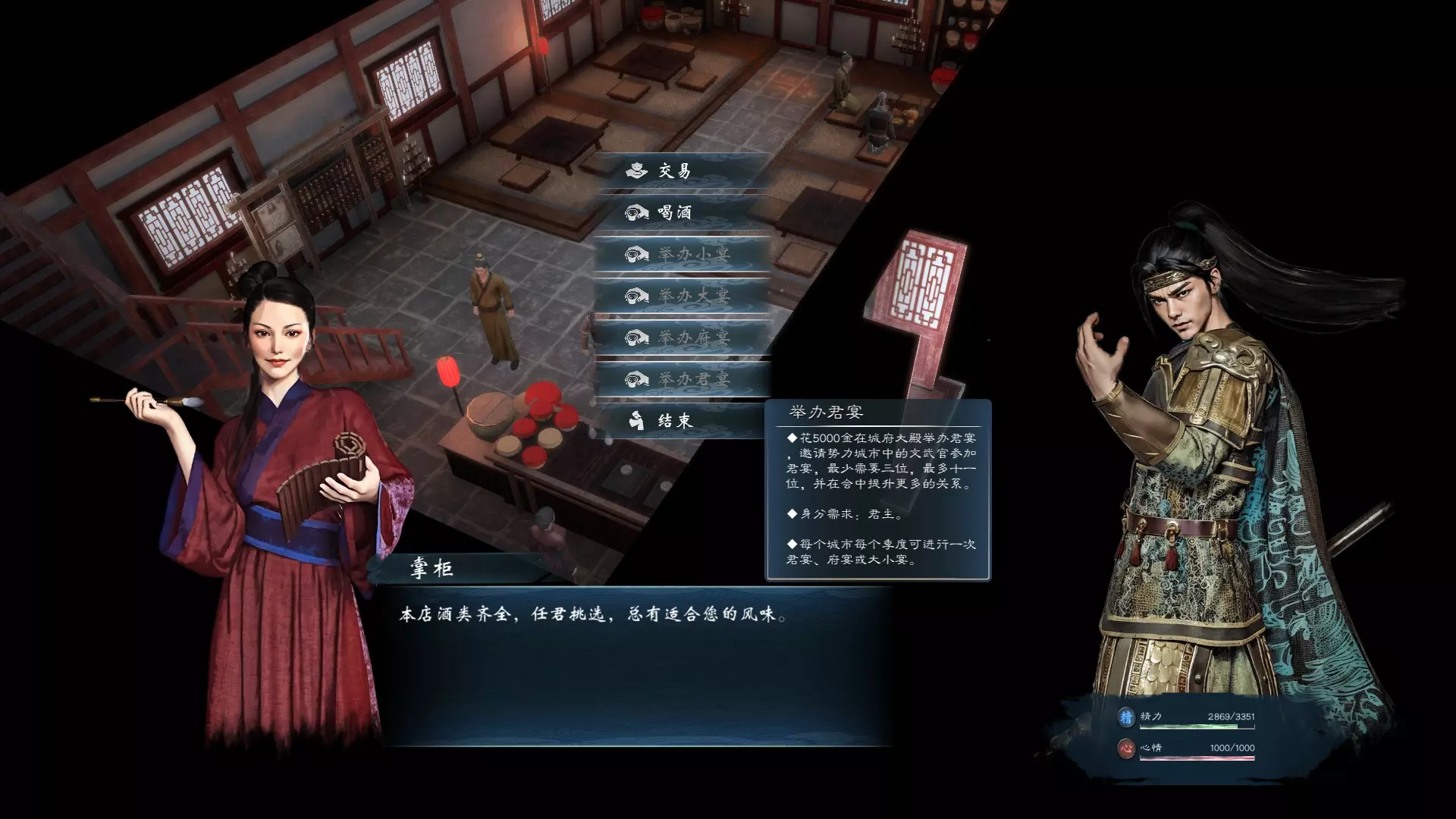 或者制作一个让玩家角色委托酒馆掌柜协助举办君宴、府宴、大小宴会的活动,以便宴请更多部将笼络人心。