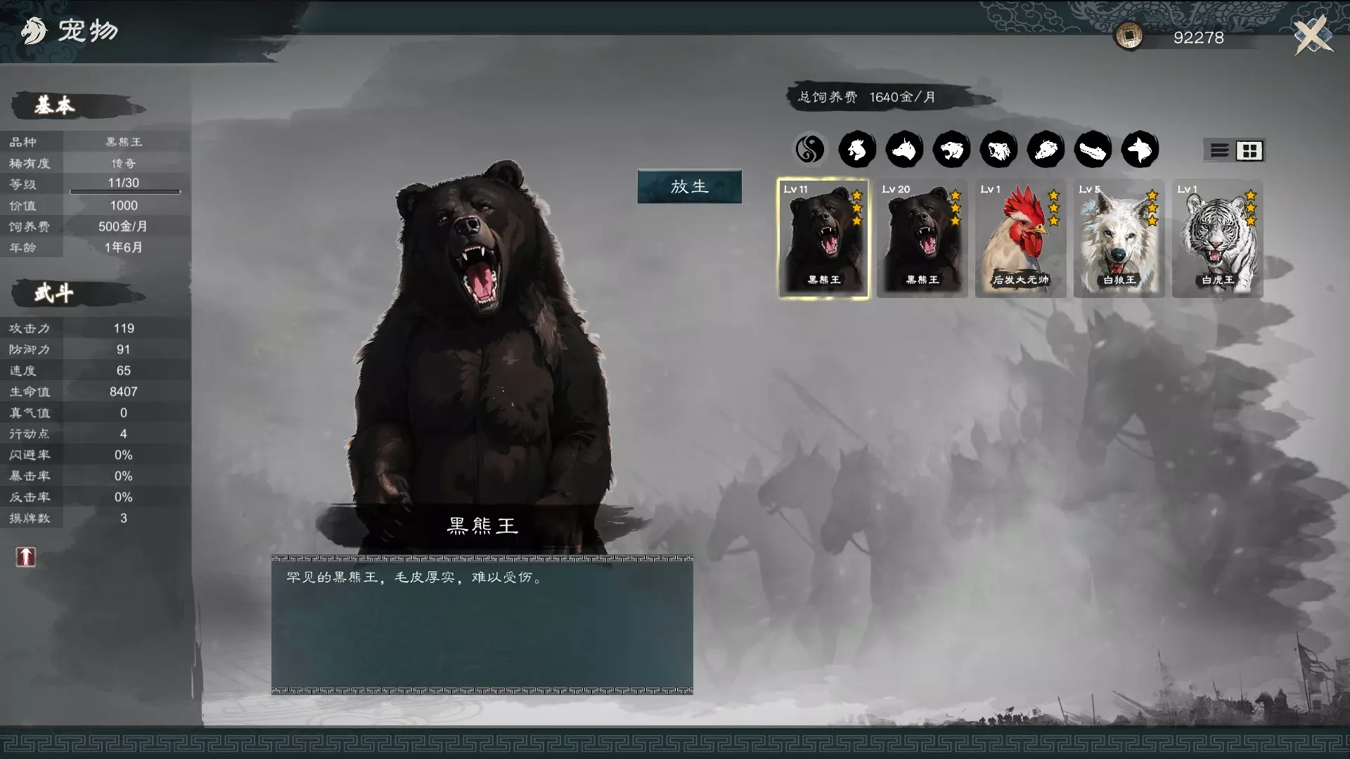 应该是还没完善,如图,那只11级黑熊王已经经历过许多战斗,但等级与经验值条没有变化。另外饲养费用的部分,图上显示是每月1640元,但实际上会受驯兽特性影响,特性越高则费用越低。目前驯兽特性5级,每月实际扣除饲养费是540元。 有些传奇品质的兽王会在任务中出现,例如黑熊王、白狼王等,有些则会在景区历练时遇到。而大地图上一般的点出现的就是优异品质的一般熊王、狼王、虎王。个人暂时还没看到传奇的鳄鱼王、野猪王等,但可提供黑熊王、白狼王、白虎王的获取来源: - 黑熊王:村庄遭受野兽袭击的任务。 - 白狼王:紧急救援使者的任务。要用倒海诀这类可以拉怪的招式使狼王在第一回合远离使者。 白虎王:在长白山区景点游历遭遇。 目前只体验过这两只传奇兽王,黑熊王是真的坦克,协助吸引火力还不错用,至少能活长一点时间,不像白狼王可能一回合就倒下了。黑熊王值得你拥有。 三星鸡则是在城镇商业发展超过12000时,在牲畜棚可以购买,在斗鸡比赛中确实比一般鸡强了不少,至少胜率实实在在地提升了。 关于私人地产