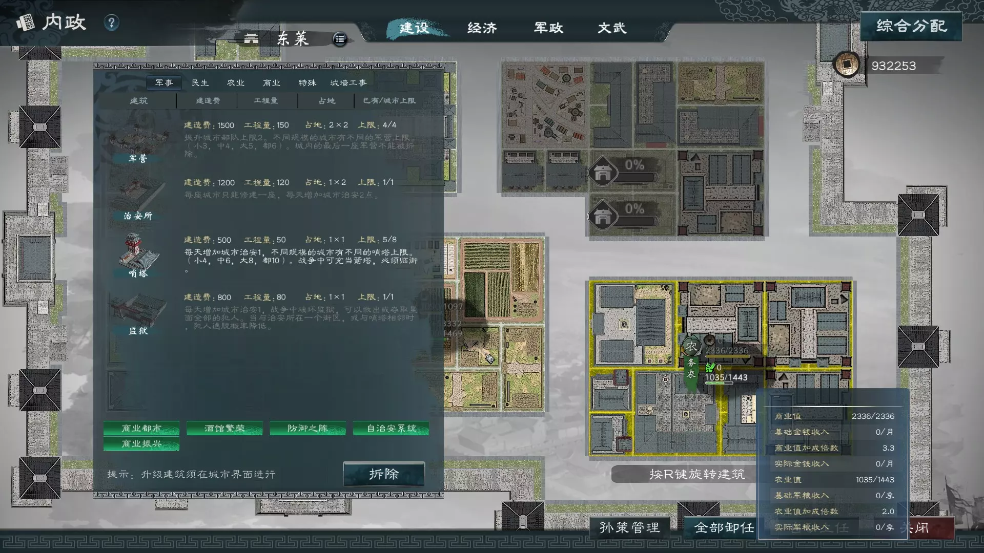 打下一座城池后,进入内政建设页面,如上图所示可以发现每个街廓的商业值与农业值上限,上限关系到收益倍率。以上图为例,3.3的倍率是该区域最高,但却被电脑用来建造行政中心。如果玩家重建时没有注意到这一点而继续建造,那么0元的3.3倍依然是0元,浪费了极高的收益倍率,农业收益也是如此。 因此,在建造生产建筑之前,需要查看街廓的收益倍率,在合适的地方建造正确的收益建筑,使倍率效益最大化,这样才能实现强兵富国。 至于如何建造才能获得最多的金钱或粮食?原则上不要盲目相信酒馆与水井的加成,要精确计算真正的收益,不过基本上可以掌握以下原则: 在高倍率商业区:能建造赌场、旅馆等就尽量建造,等建满后考虑酒馆以及市集,最后再考虑商店街。 在高倍率农业区:能建造大农地、畜生棚、农工厂就尽量建造,建完之后再考虑水井与其他中小农地的摆放。 肥料厂与招商行:基本上在初期缺少人手时可以使用,实际测试并不会增加超过各项数值上限,也就是无法影响该街区的收益倍率,因此,除非是配合城池特色需求而建造,否则基本上都可以省略。 武斗进阶观念