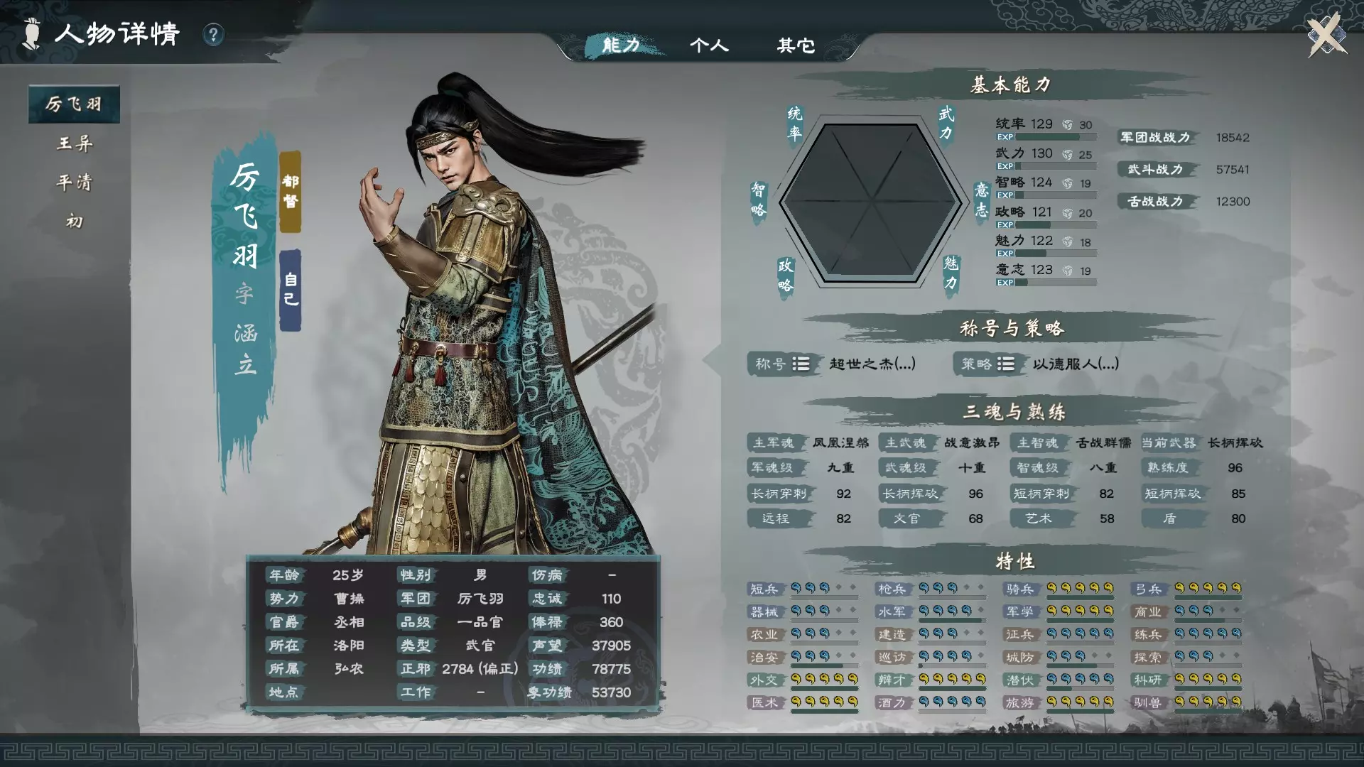 游戏中可以获得各种各样的特殊称号证书,主要用于强化人物的学习成长、内政效果、军事效果等。比较常见的有比武大会的天下极武与天下极谋等,此外通过相关剧情事件或结婚彩礼也能获得其他来源暂时不明的特殊称号证书。其中比较重要的一点是,初期能尽早获得有利于魂量增长的证书,备注如下: 金色证书:神造之才-三魂点获得速度提升25%。 同类金色证书与银色证书不叠加,例如神造之才(金)与天赋绝伦(银),先使用银色证书后可以再使用金色证书覆盖银色的效果,先使用金色证书的话则无法再使用银色证书。家将培养、科技研发、专用书籍 关于家将 当我们处于在野或仕官状态时,家将可以提供以下协助: 1. 同一势力下会为我们贡献功绩。 2. 长期跟随身边参与战斗。 3. 非君主时期帮忙研发科技。 4. 初期协助招募私兵。 如果喜欢带着双修妻子修炼三魂,那么让家将跟随身边这一优点会与妻子双修三魂产生冲突。个人建议还是让双修妻子跟随身边,若不是新创建一个能直接修炼三魂的新角色作为妻子,基本上身边的三个位置都会被妻子占据。 因此,妻子必须培养成强大战力,因为她们都会跟随身边参与战斗。 那么家将就主要负责帮忙积累功绩、研发科技和招募私兵。因此研发科技需要看特性,要研发到二级、三级都需要极高的特性,也就是科技树那里写的适性2、适性4,所以家将的培养在于术业有专攻,重视高特性。 而招募私兵部分当然就看征兵与练兵。 等到成为君主后,家将的优势会降低,毕竟已经可以登庸其他文武官员,但家将毕竟有培养关系,所以忠诚度上限会较高,而且在君主下野历练的时候,也还能通过家族功能调派,还是挺方便的。 家将招募还是以研发所需的特性较高者为主,毕竟研发需要的特性要求就摆在那里。原则上可以秉持着这个概念【带在身边的双修角色培养六维和三魂,其他角色以及家将重视(培养)特性】。如何招募家将 义结金兰:目前义理话题可通过阅读书籍大量获取,因此义结金兰反而成为最廉价的方式。若不喜欢与过多人结义,可继续参考以下方法。 降忠邀请:与其他势力的文武官员关系良好,当双方关系达到好友(3级)时,若对方忠诚度不高,即可邀请其加入家族。对方忠诚度的高低主要与其隐藏义理值相关,通常忠诚度在70以下时较容易招募,若对方义理值特别高,则需要更低的忠诚度才有可能成功。降低忠诚度的途径如下: 被其他势力俘虏:等待其忠诚度下降后,准备好礼物去解救他。只要他被解救后拥有三个社交兴趣点数,就能在他返回原本势力据点的途中邀请其加入家族。计谋降低忠诚:通过计谋针对性降低该武将忠诚度,等他降得足够低时,准备好礼物让他恢复足够三个社交兴趣点数,就可以邀请他加入家族。 流放邀请:有时候通过登庸战争俘虏或者被其他托管都督登庸的在野人才,他已经是我方势力的文武官,当下无法邀请加入家族,可以将他的关系提升后,确认有三个社交兴趣点数,流放他再邀请他加入家族。 关于科技研发