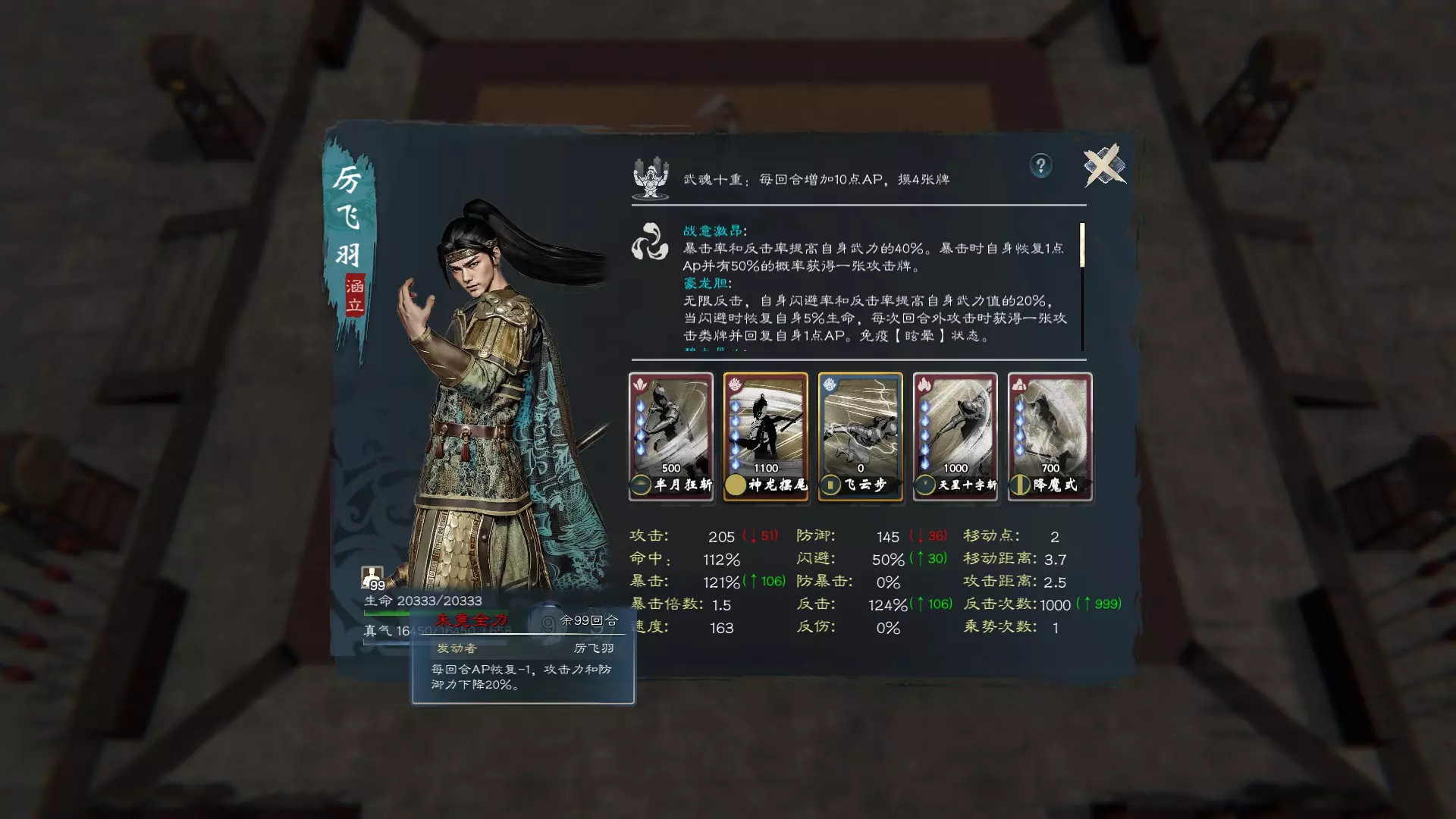 六维推荐 统率:95+ 武力:92+ 智略:94+ 政略:80+ 魅力:90+ 意志:95+ 军魂推荐 若统率未满100,军魂之魂可选择金系青龙啸天,或自行搭配如金系生擒(大)+水系聚气(大),军团战实际作战时可着重以下几个部分:蓄力恢复速度、破坏建筑效率、生擒敌将概率等。 军魂之技可选择一个主攻技如无属性的摧心之箭,搭配一个辅助技能如木系巧变或水系复兴汉室。 人物装备宝物可额外提供一个军魂之魂,可根据需求选择搭配。 武魂推荐 目前实际体验来看,肉盾流比闪躲流稳定,闪躲流面对高爆发对手(如关羽)时比较依赖运气,运气不好就需要读档重来。若武力未满100,武魂之魂可以选择土系气盾,有余力可再加上水系麒麟血脉,非常抗打。 武魂之技可以选择金系范围流血技能,水系吞天诀补血补气,再加一个无属性飞云脚,切记牌多不一定好,关键能打出来最重要。 武器选择上长柄挥砍最暴力,长柄穿刺很飘逸,短柄挥砍与穿刺打得慢一些但机动性也都不错,长柄穿刺有额外的位移攻击卡,不需要自己选的那种。 智魂推荐我们以比对手慢出手作为考量依据。 由于比对手慢出手,智魂之魂优先选择木系舌战群儒,若有余力再搭配火系必中之魂。智魂之技选择木系的解、水系的识破、火系的语惊四座,无属性的同归于尽。 若智力达到100,基本上没有人会比你快出牌。智魂之魂除了主要推荐火系的必中之魂外,其他可自由搭配多抽牌、多给AP的智魂之魂。 装备推荐: 头盔务必选择有加命中的。 胸甲可以选择有加闪躲或真气的。 武器可以选长柄挥砍或自选喜欢的类型。 目前还没在游戏内取得名将专武,除非后续新增内容中加入第二件。若不想出现两把青龙偃月刀这类出戏的情况,可以先选择紫色平替品。初次接触游戏的话,可以创建一个100武力的武将按照上述配置体验看看,武将比文官强势不少,加上我们设定的智略也较高,可谓文武双全,较容易上手。 文官创建推荐