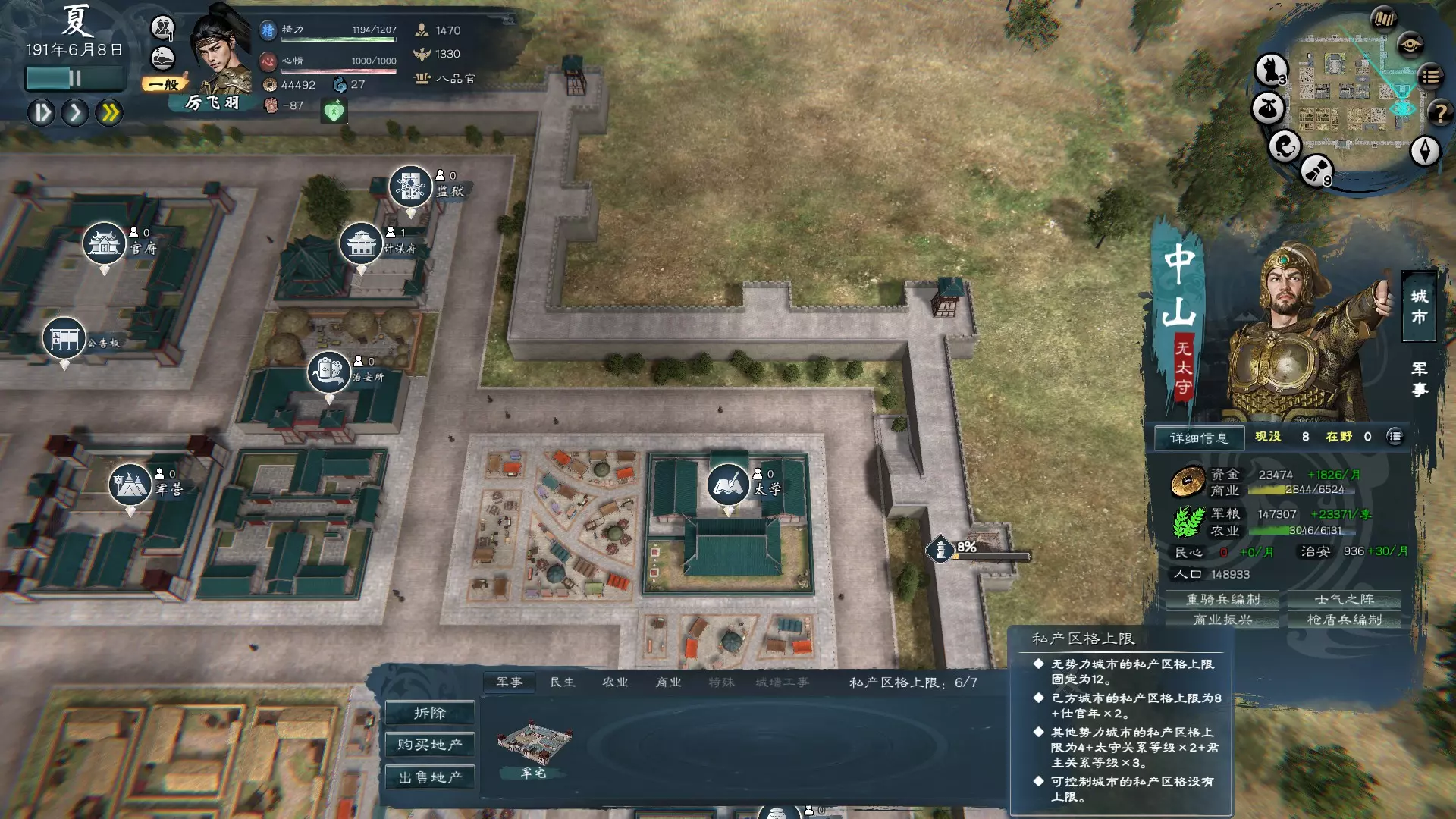 建造时建筑旋转热键是R 可购买的私人土地格子数量如下: 无人区最大上限为12格。 己方阵营控制区域上限为8+仕官年数×2。 非己方势力上限为4+2×太守关系等级+3×君主关系等级。 最后一点的意思应该是君主则无限制(?)。 测试了这么长时间还没玩到君主,苦命的打工人。 景点的历练与修炼