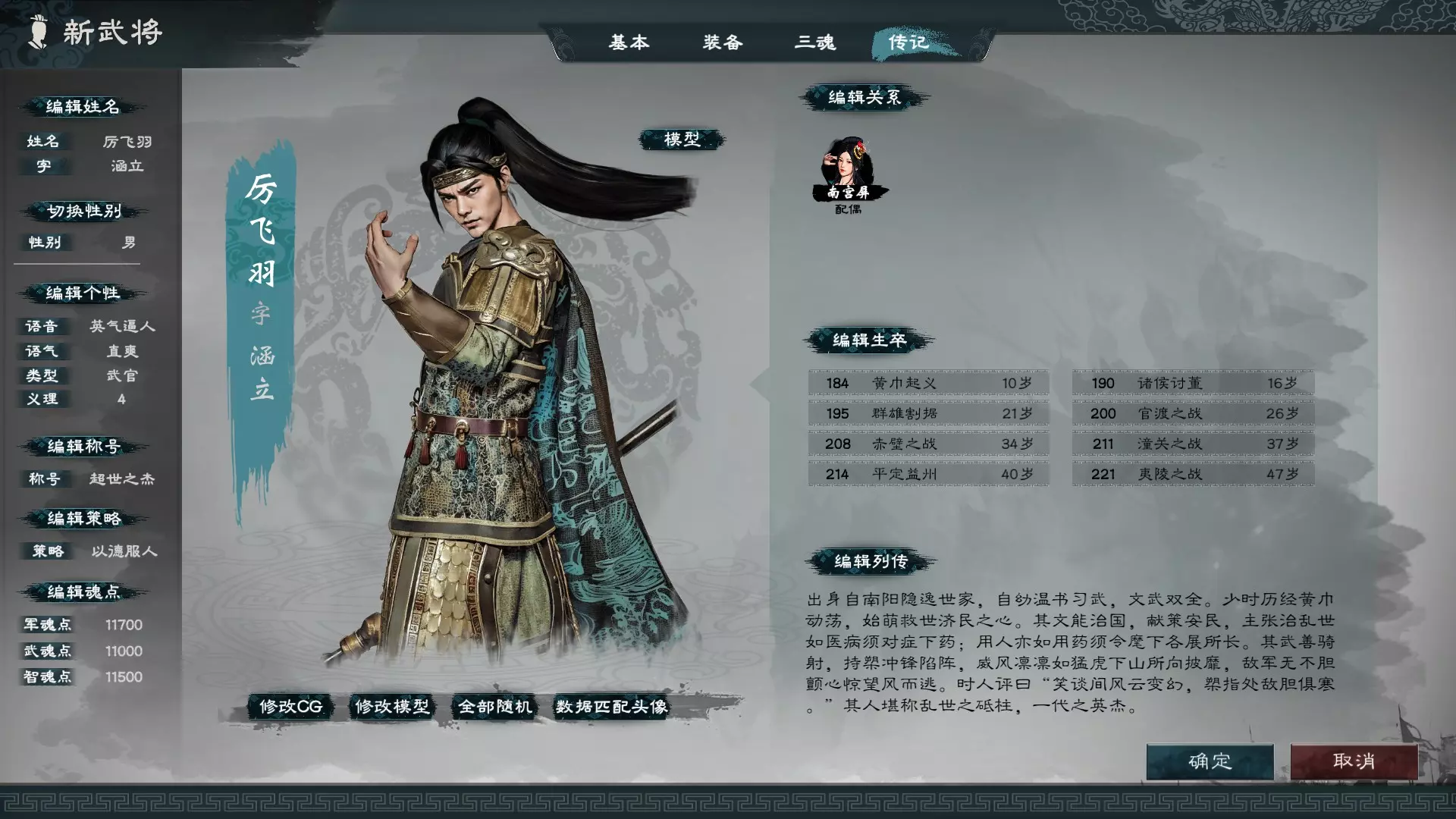 【游戏更新内容】 1. 六维顶点初始非100,游戏内可成长至超过100;六维资质在创建角色时最高为SS,进入游戏后显示的数值为18,游戏内可通过使用资质书提升至30。 2. 三魂方面,统率影响军魂数值,武力影响武魂数值,智略影响智魂数值;三魂的数值高低决定了卡牌数量上限以及能容纳的卡牌魂量。 3. 速度方面,实战中武力和智略也会决定行动顺序。 4. 文斗策略:文斗注重先后顺序,若想先攻,智略需较高,优先出牌可根据情况选择进攻或防御,较为便捷;若不希望智略过高,则需考虑比敌人慢出牌时的保命机制。 5. 武斗流派:武斗中,生存是输出的前提,生存主要依靠闪避、高坦度以及回血技能,保住性命后再考虑输出技能。文官的武魂由武将的武力决定,而文官可以通过文官武器用智魂取代武魂的数值。 五行卡牌属性分为金木水火土,各属性有各自的特殊卡牌,其他无属性卡牌则可通用插在不同属性槽内。 性格玩家无需选择,因为不会增加关系。 特性等级提高会解锁更多内政或野外功能,建议尽量都高于3级,选择六个你认为重要的特性提升到5黄(即6级),例如军学、科研、辩才、医术、偏好军种等。特性最高成长到6级。 装备中的名将专武均为传奇品质,具有唯一性,通常在游戏内不会出现第二把,除非你在自创角色中选用并带入该局游戏。其中最重要的是头部有增加命中的属性,建议优先选择带有命中属性的头部装备。 武器熟练度方面,主要使用的类型建议设定为90以上,次要使用的70以上,不使用的50以上,具体的调整方法可以请教他人。熟练度最高只能成长到100。 关系系统默认可以新增三位妻子和三位义兄弟姐妹,进入游戏后还可以继续结婚和结交,应该没有数量上限。妻子和义兄弟姐妹会直接成为家将,父母虽然不是家将,但很容易邀请加入,而义兄弟姐妹的配偶则需要从零开始培养。 新武将需要年满16岁才能登场,人物的最长寿命为100岁。 人物列传在进入游戏后无法编辑,所以在意人物列传内容的玩家记得提前写好。
