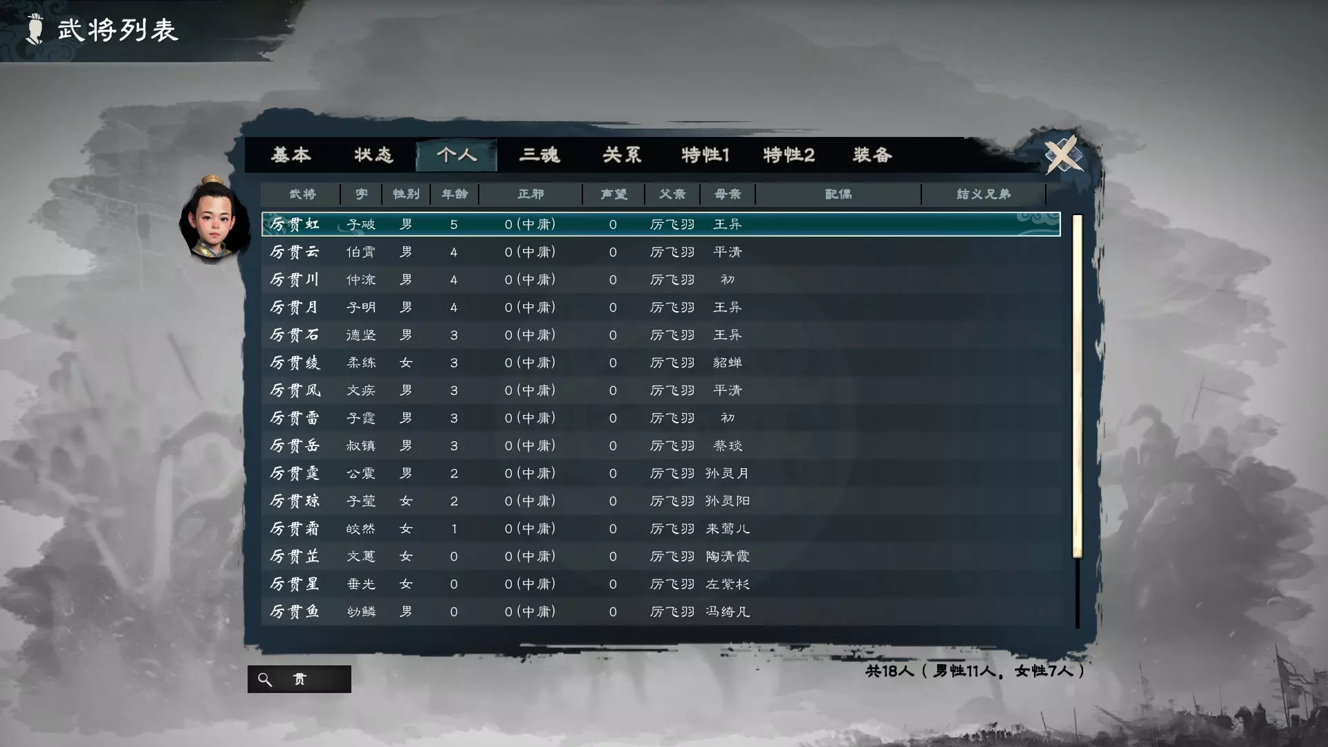 至于孩子的立绘,从上图可知,长子立绘沿用了父亲厉飞羽的立绘,但下图中次子的立绘则不同,看样子应该是随机从自创武将的那几款NPC立绘中选择孩子的立绘。